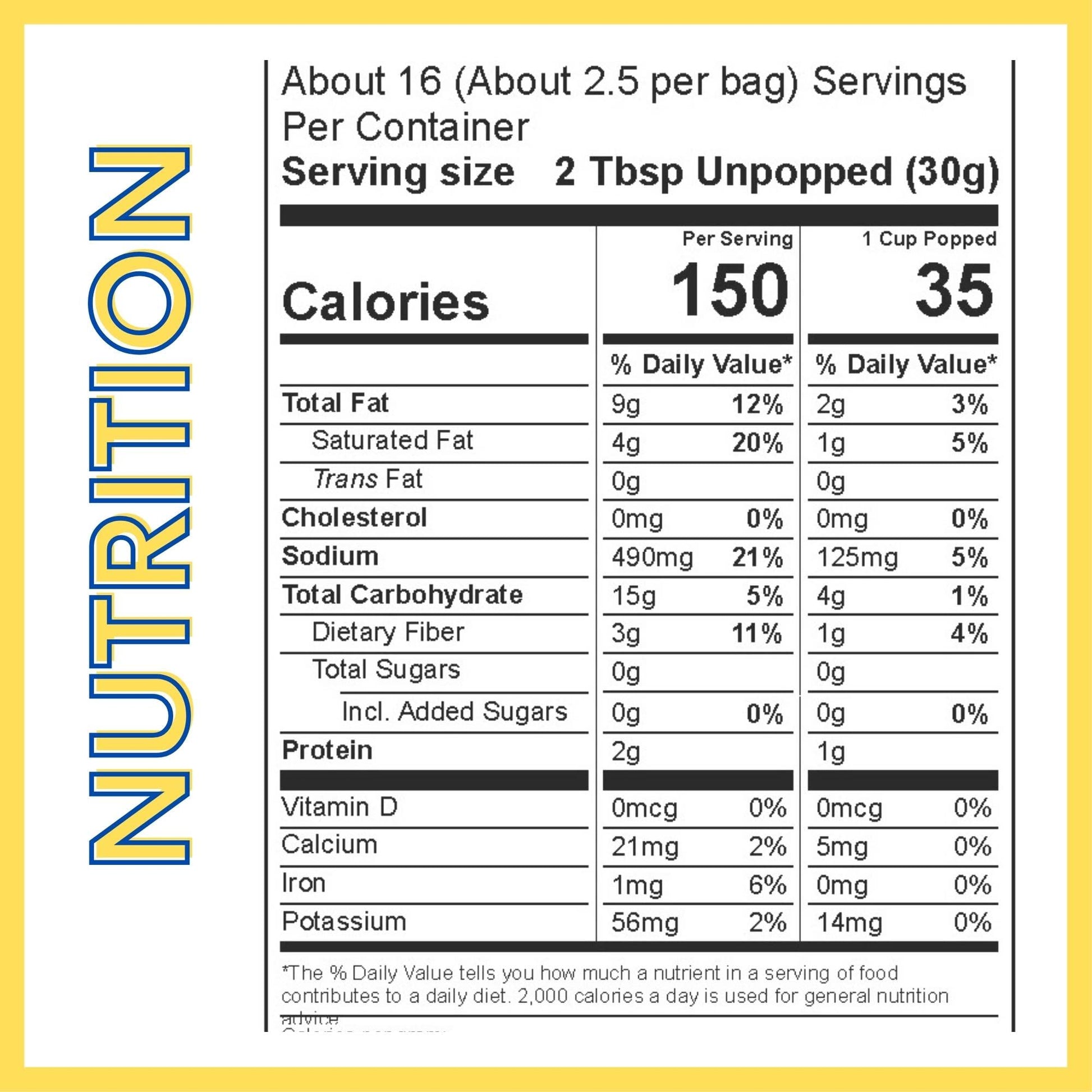 Q: How many calories are in each serving of this popcorn?A: Each serving of Cousin Willie's White Cheddar Microwave Popcorn contains just 35 calories per cup, making it a low-calorie snack that doesn't compromise on flavor.