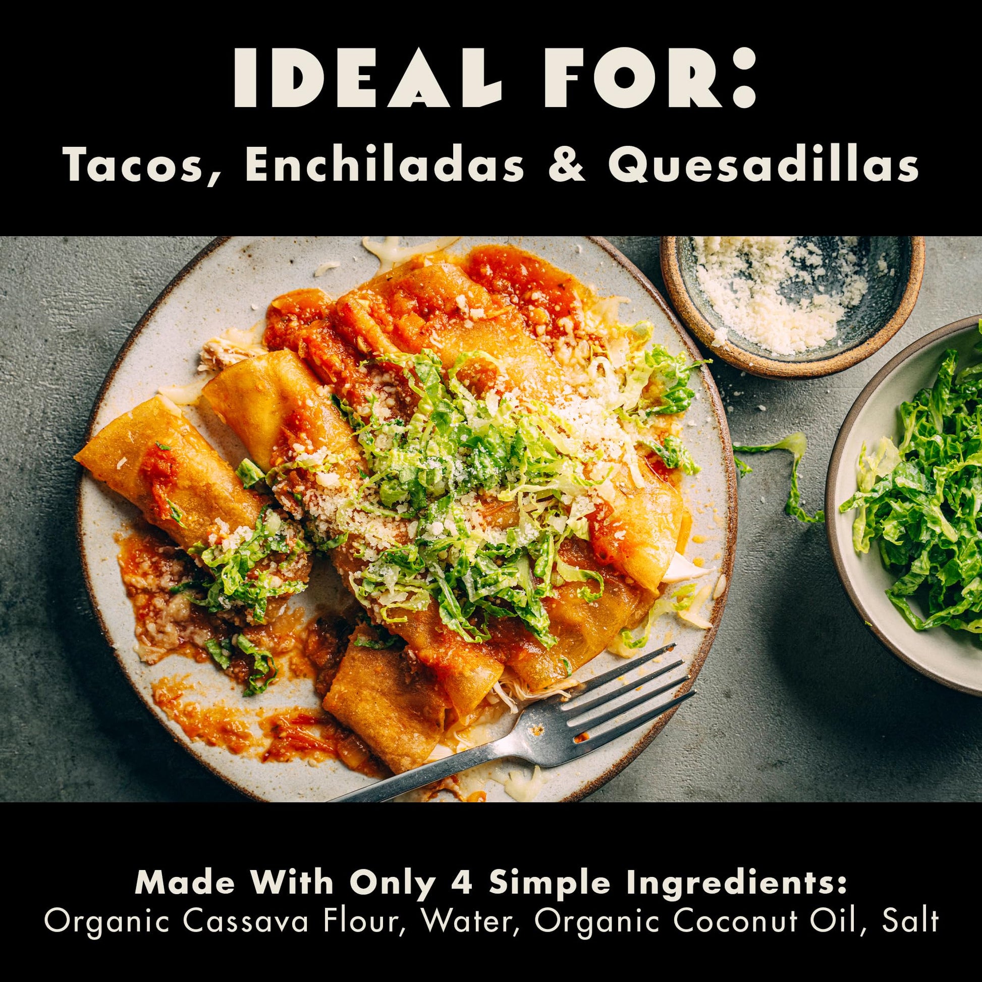 - Q: What are Coyotas Organic Cassava Tortillas made of? A: Coyotas Organic Cassava Tortillas are made from cassava flour, water, coconut oil, and sea salt. This simple ingredient list ensures they are grain-free, gluten-free, and suitable for a variety of dietary preferences.