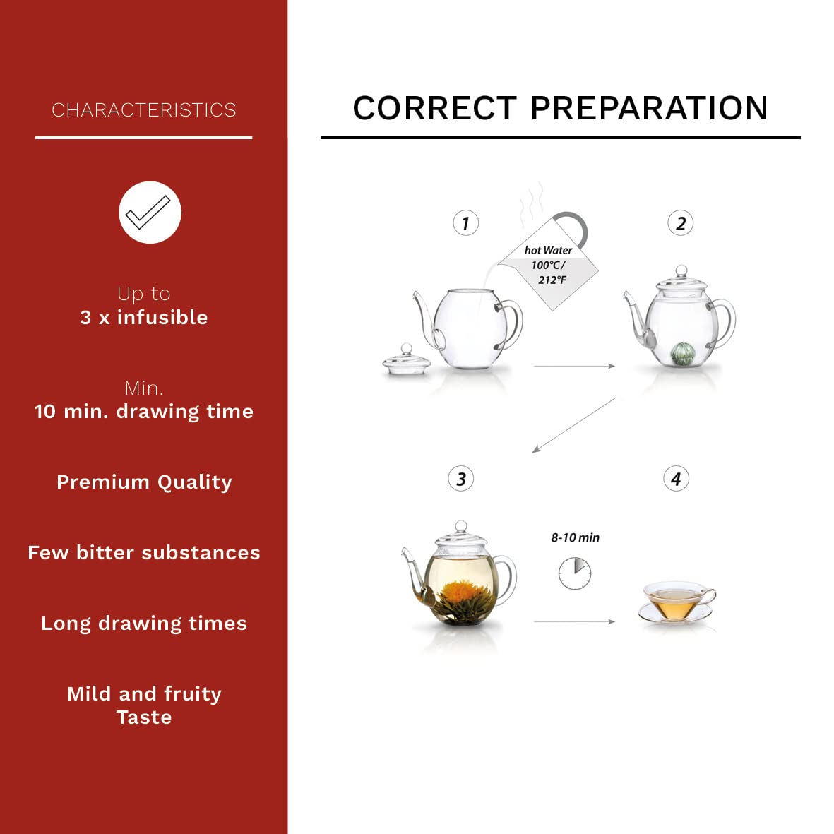 Q: How many times can I infuse each Blooming Tea Flower?A: Each Blooming Tea Flower can be infused up to 3 times, yielding approximately 50oz (1.5 liters) of tea, making it a great choice for tea connoisseurs.