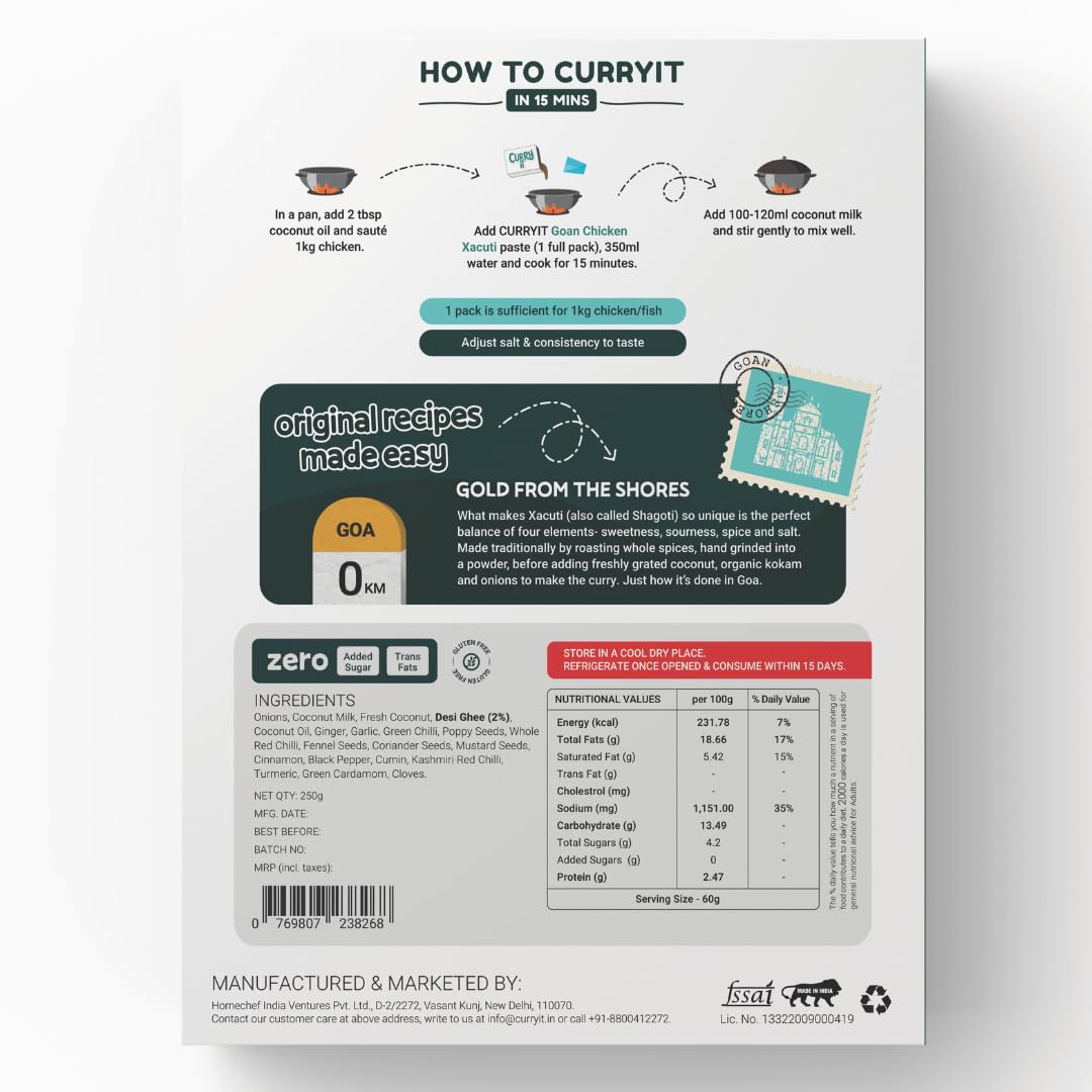 - Q: What is CURRYiT Ready To Cook Classic Goan Xacuti Masala Curry Paste? A: CURRYiT Ready To Cook Classic Goan Xacuti Masala Curry Paste is a convenient Indian masala gravy made with ghee, designed for quick meal preparation. It allows you to create a traditional Goan Xacuti curry in just 15 minutes, making it perfect for busy individuals who want to enjoy authentic flavors without extensive cooking.