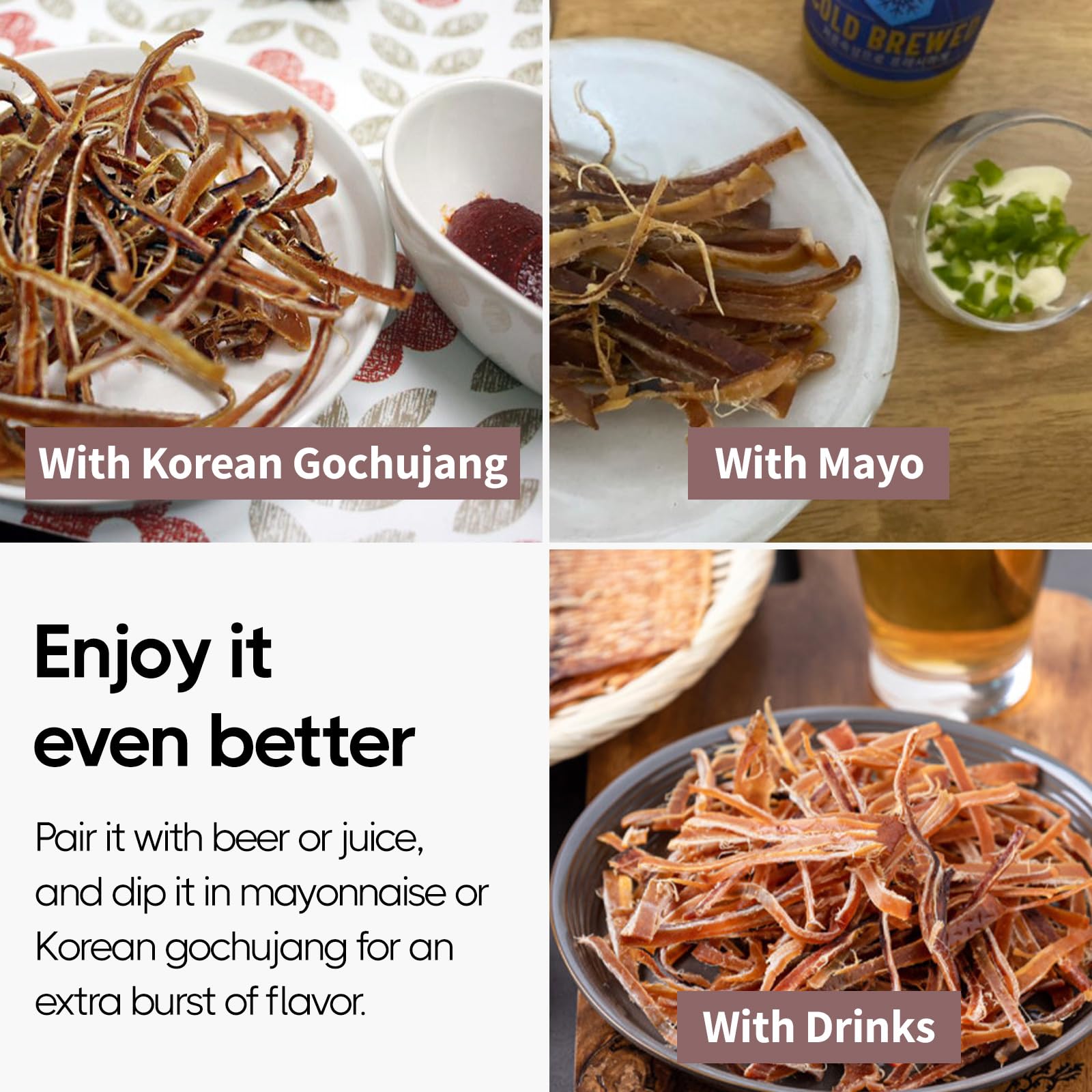 Q: How should I enjoy CUTIE MANGO Dried Squid?A: This dried squid can be enjoyed straight from the pack as a tasty snack. It pairs exceptionally well with drinks and can also be dipped in sauces like mayonnaise or gochujang for added flavor.