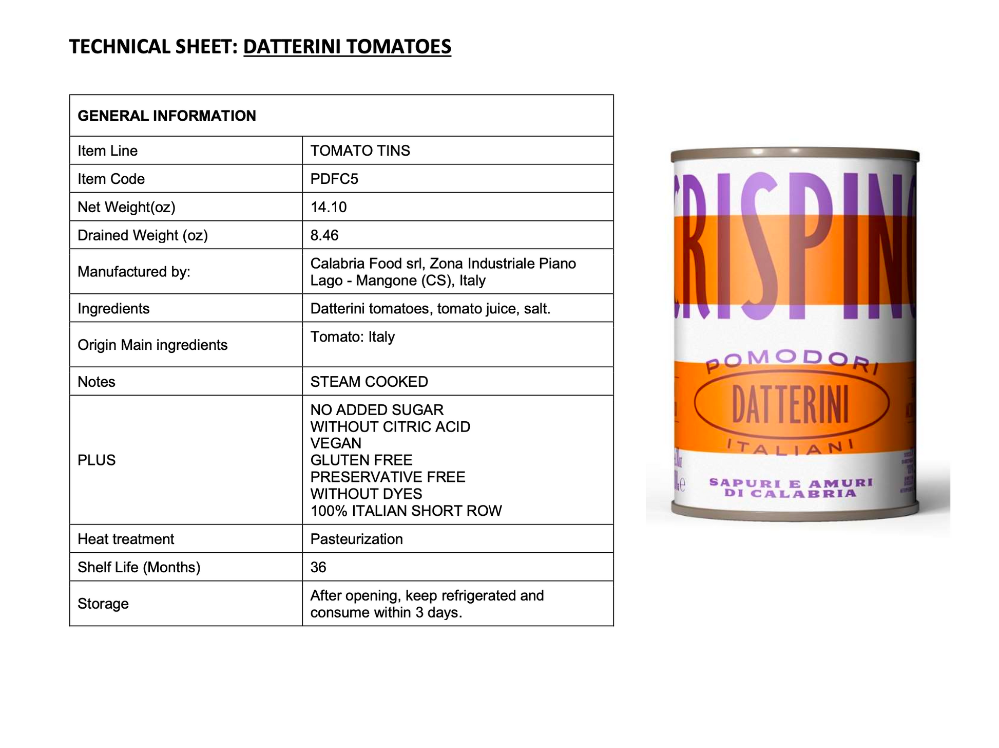 Crispino Datterini Tomatoes represent one of Calabria’s most iconic ingredients: small, sweet, intensely flavorful tomatoes grown in short-row fields under the Southern Italian sun. Known for their naturally rich sweetness and silky texture, Datterini are the tomato of choice in Southern Italy for quick sauces, seafood dishes, and modern Mediterranean cuisine.