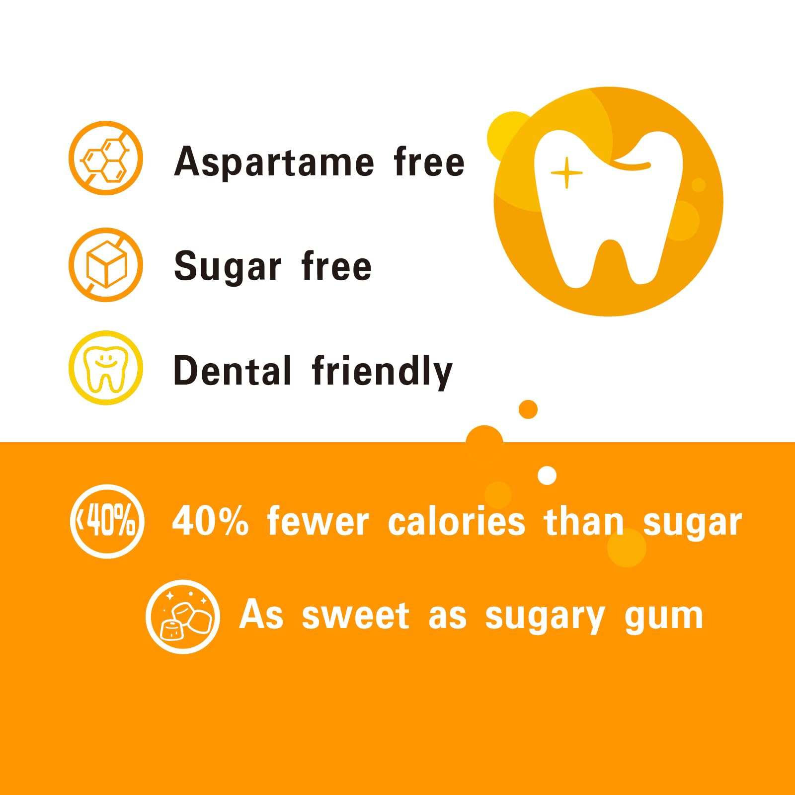 Q: How does xylitol in chewing gum benefit dental health?A: Xylitol is dentist-recommended for its ability to reduce harmful bacteria in the mouth, decrease the rate of tooth decay, and stimulate saliva production, which helps maintain a balanced pH level.