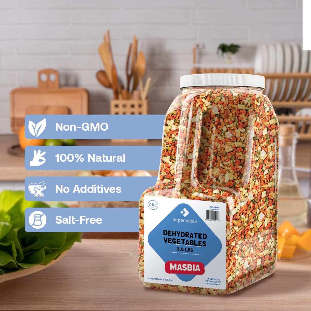 Q: Is the packaging of the dehydrated vegetables convenient for storage?A: Yes, the dehydrated vegetables come in a bulk 3.5 lb. jug, which provides ample supply and is designed for easy storage in your kitchen. The container keeps the product fresh and accessible for your culinary needs.