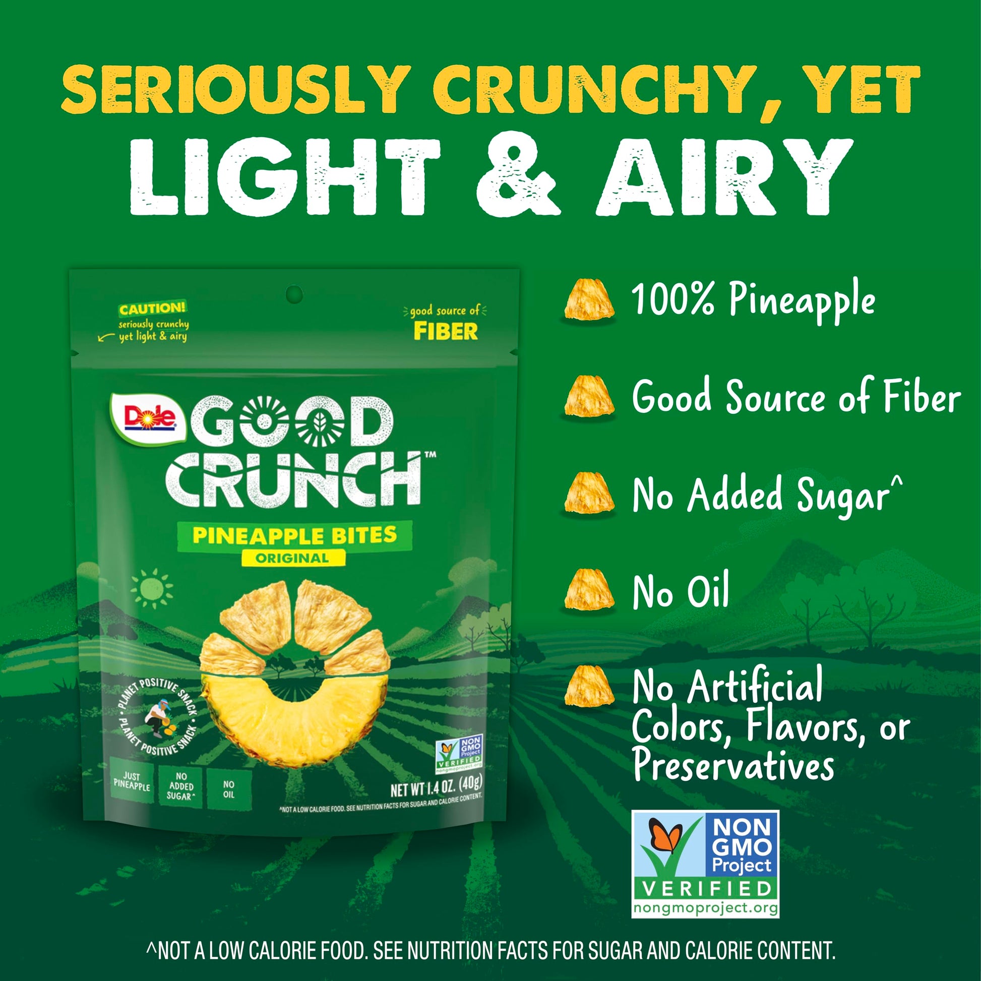 CLEAN LABEL: Made with all-natural fruit, Dole Good Crunch Pineapple Bites are vegan, non-GMO, and free from artificial colors, flavors, and preservatives. Snack confidently knowing you are choosing a clean and wholesome product.