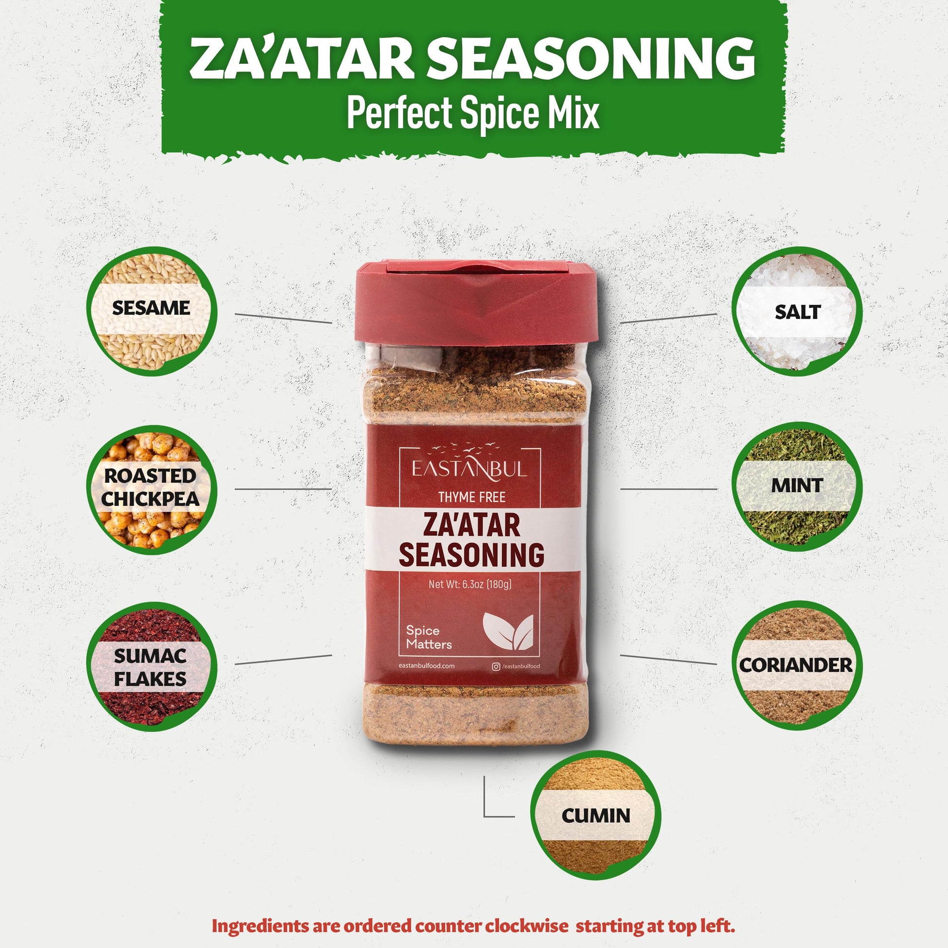 Q: What are the ingredients in Eastanbul Zaatar Seasoning?A: Eastanbul Zaatar Seasoning contains sesame, roasted chickpeas, sumac flakes, sunflower seeds, cumin, coriander, and mint. The recipe may vary by region, but these ingredients deliver a unique tangy, nutty, and herbal flavor.