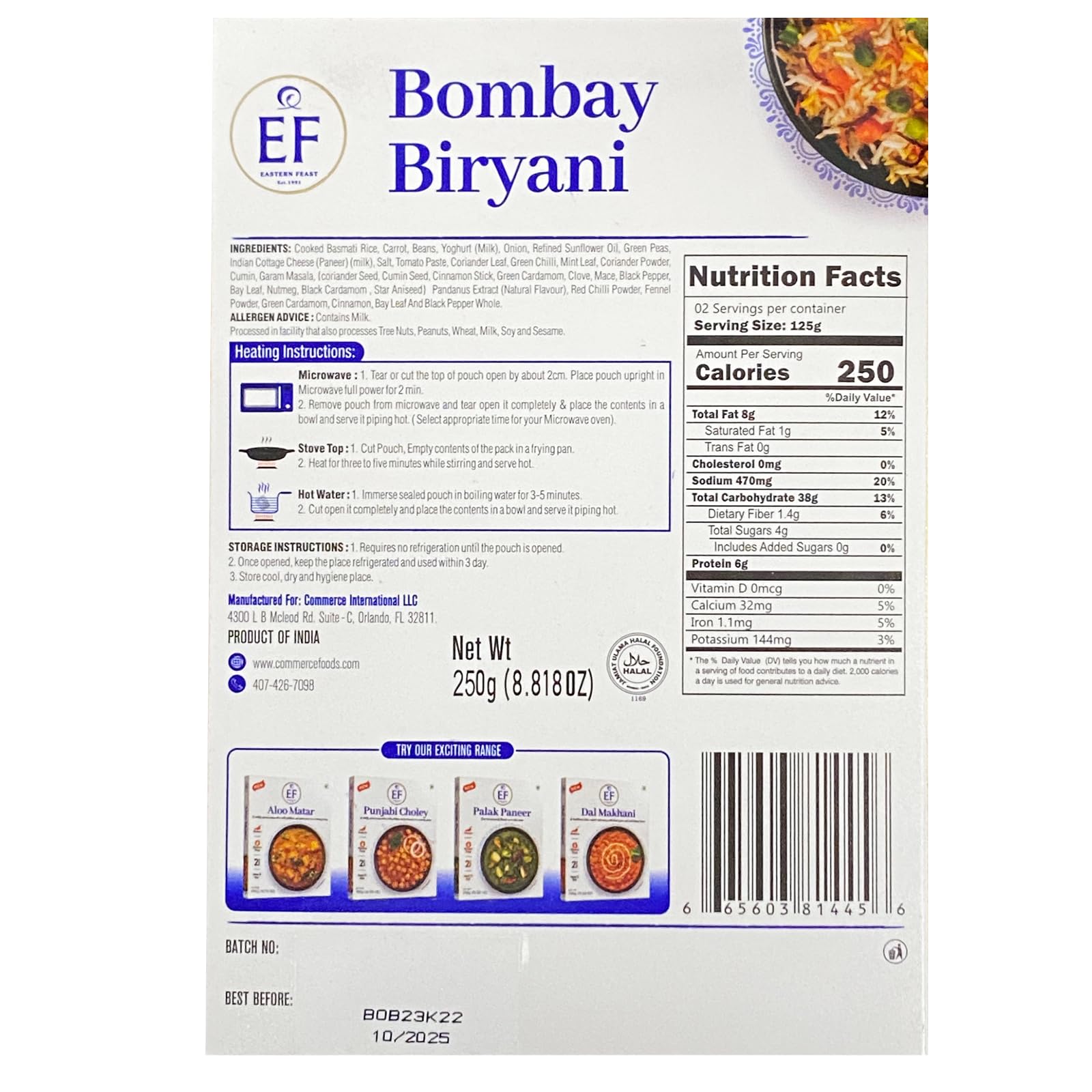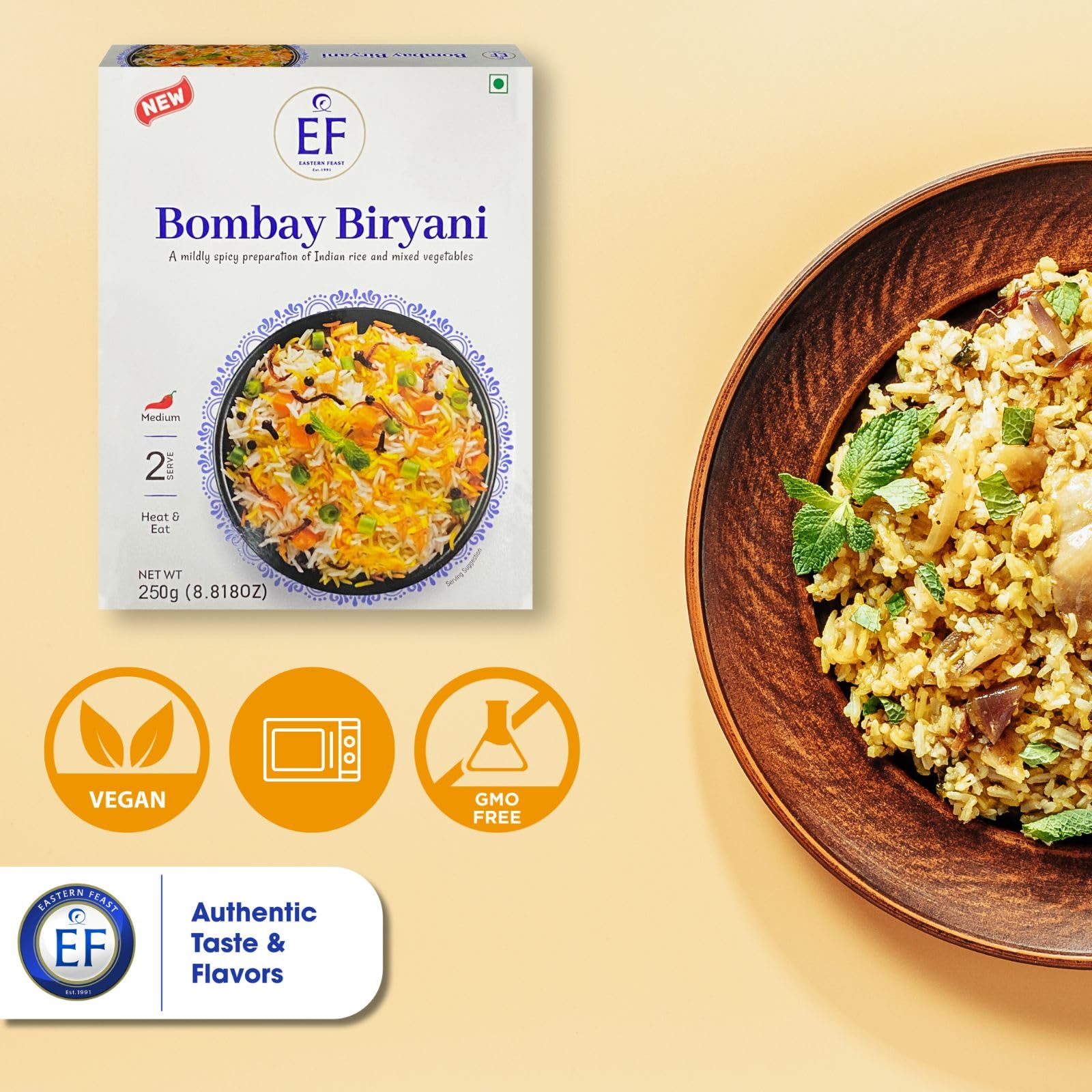 Q: What are the ingredients in Eastern Feast Bombay Biryani?A: Eastern Feast Bombay Biryani features a blend of nutritious vegetables, grains, and authentic Indian spices. Each meal is prepared using traditional recipes, ensuring a delicious and healthy vegetarian option.