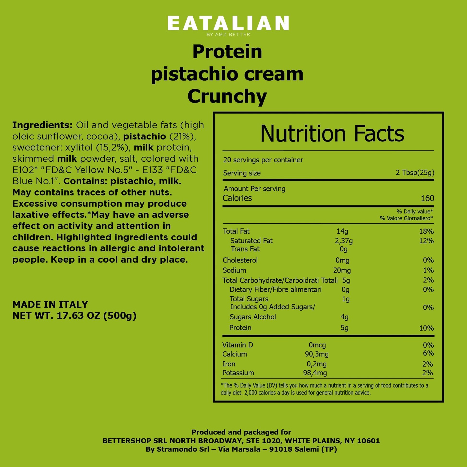Q: Where is EATALIAN Pistachio Protein Cream made?A: EATALIAN Pistachio Protein Cream is proudly made in Italy, specifically in Sicily, where only the finest pistachios are selected for production.