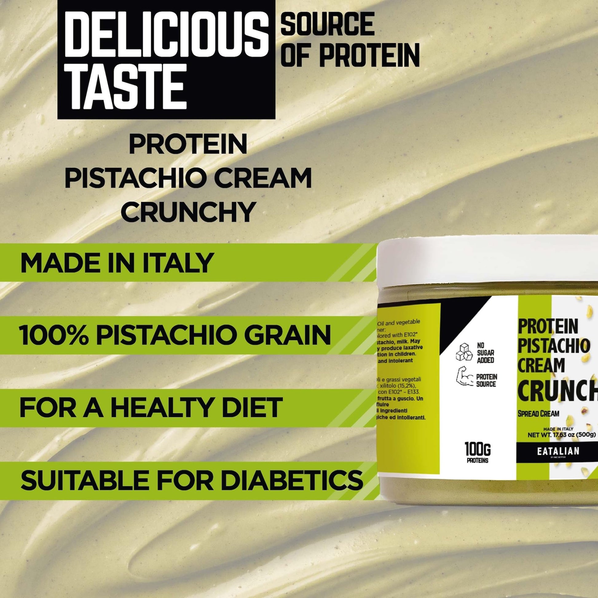 Q: What are the ingredients in EATALIAN Pistachio Protein Cream?A: EATALIAN Pistachio Protein Cream is made with simple, natural ingredients sourced from the best raw materials in Italy. It includes high-quality pistachios and is designed to provide a delicious and creamy texture.
