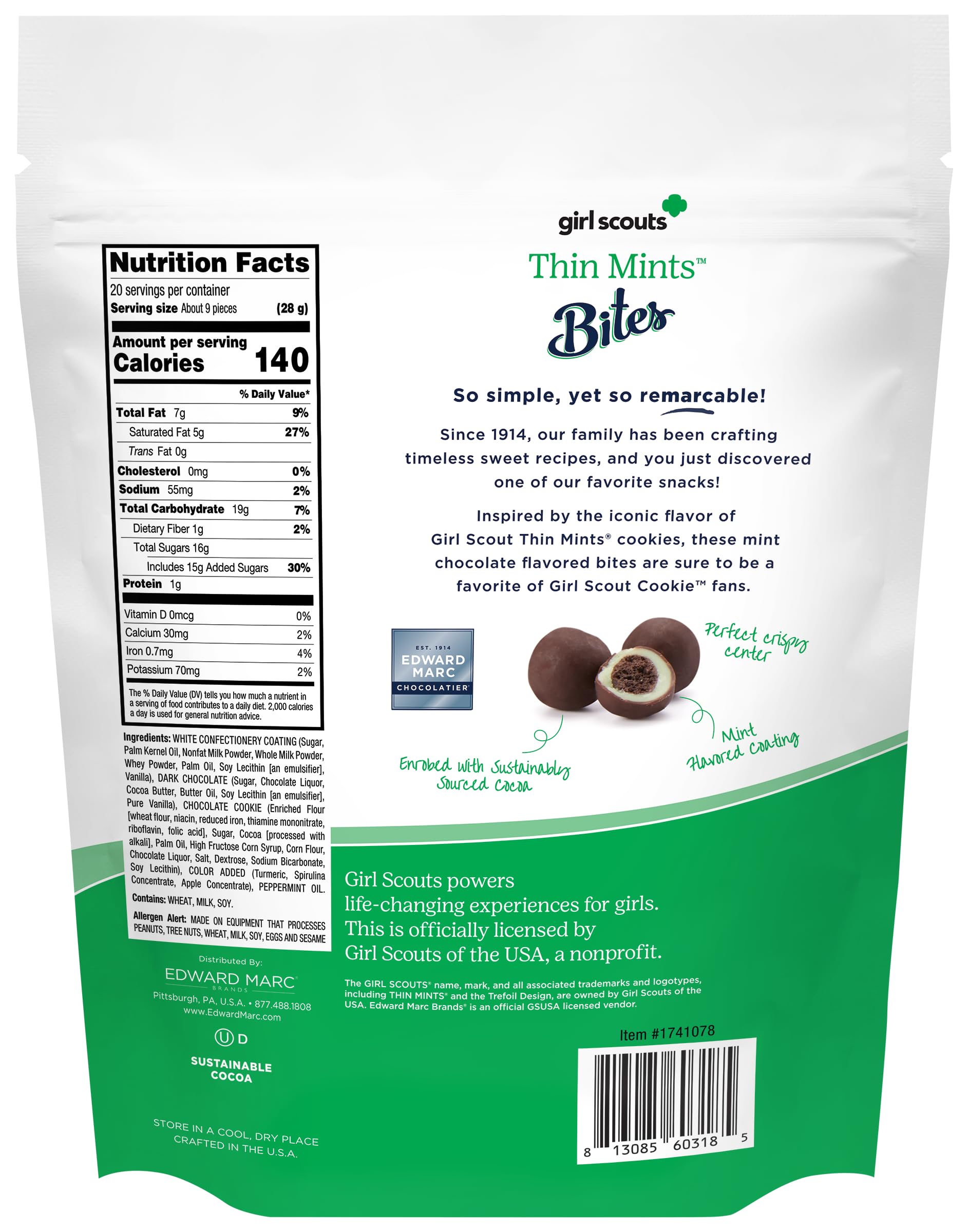 - Q: What makes Edward Marc Thin Mint Bites different from regular chocolate snacks? A: Edward Marc Thin Mint Bites are inspired by the beloved Thin Mints Girl Scout Cookies, featuring a unique crispy cookie center combined with refreshing mint and rich dark chocolate, creating a distinct flavor that sets them apart from standard chocolate snacks.