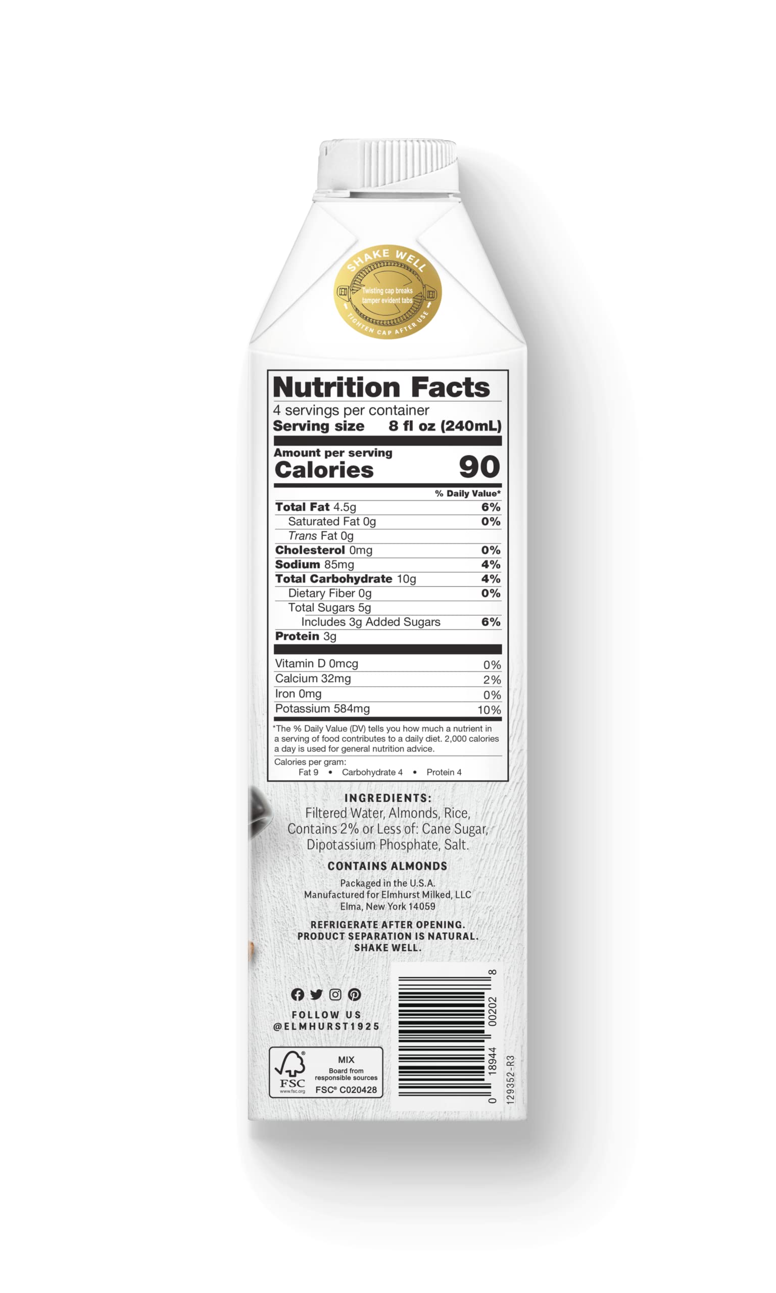 - Q: How should I store Elmhurst 1925 Almond Milk once opened? A: Once opened, Elmhurst 1925 Barista Edition Almond Milk should be refrigerated and consumed within 7-10 days for optimal freshness. Before opening, it is shelf-stable and can be stored at room temperature.