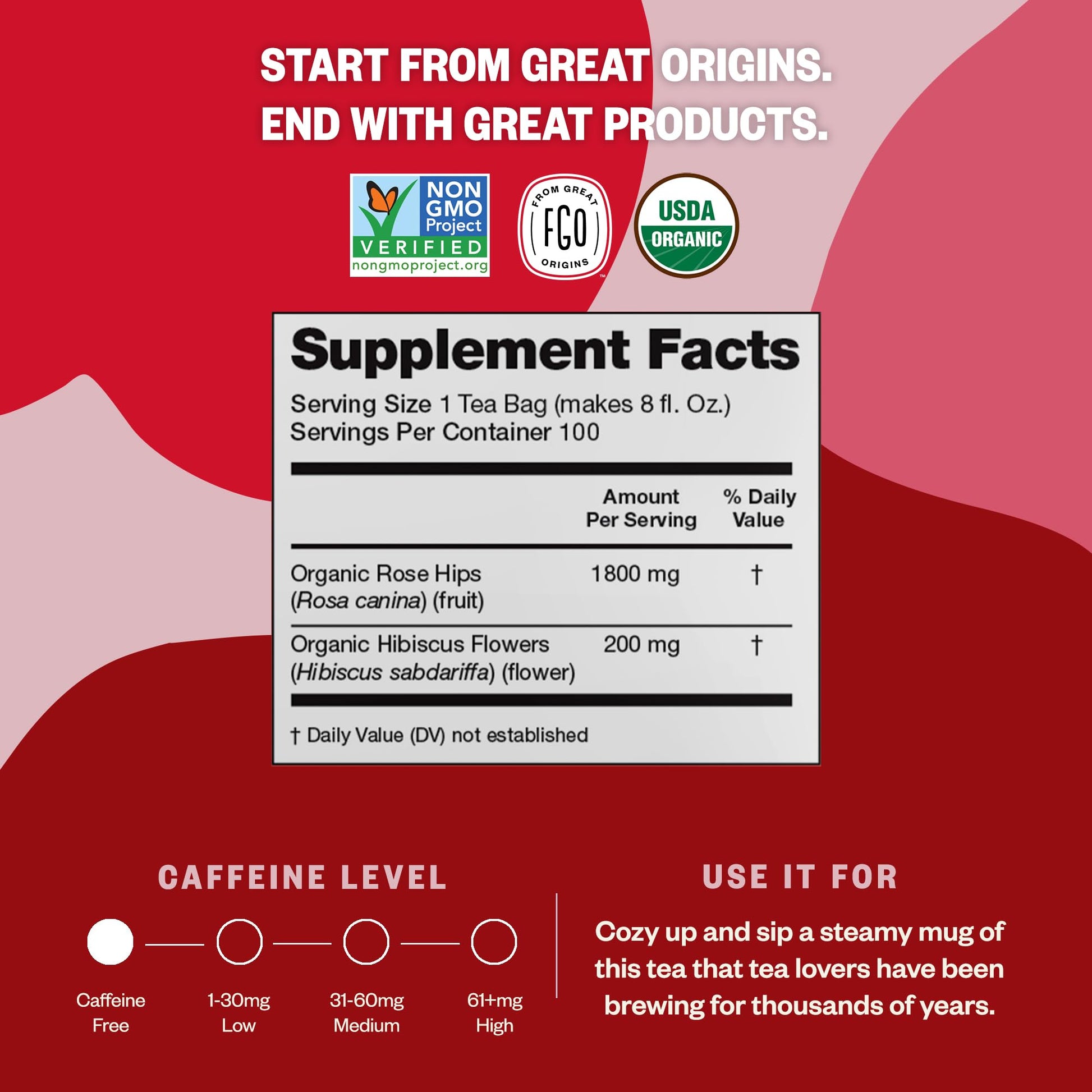 Rosehips Tea Bags - 100 Tea Bags Filled With Premium Rose Hips From Chile And Hibiscus From Egypt. | Organic Rose Hips Tea - The Tea Is Filled Into Tea Bags And Packed Into Foil-Lined Kraft Bags In California | 100 Eco-Conscious Tea Bags - Our Premium Tea Bags Are Constructed Of Abac