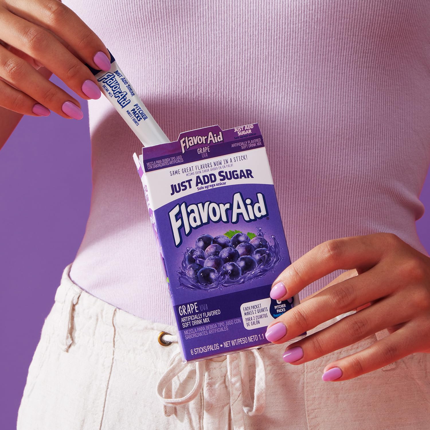 Q: What are the benefits of using the stick packaging for the Flavor Aid Grape Drink Mix?A: The stick packaging of the Flavor Aid Grape Unsweetened Drink Mix offers convenience and portability, eliminating the mess of traditional packets or bulky canisters, making it easy to mix and carry.