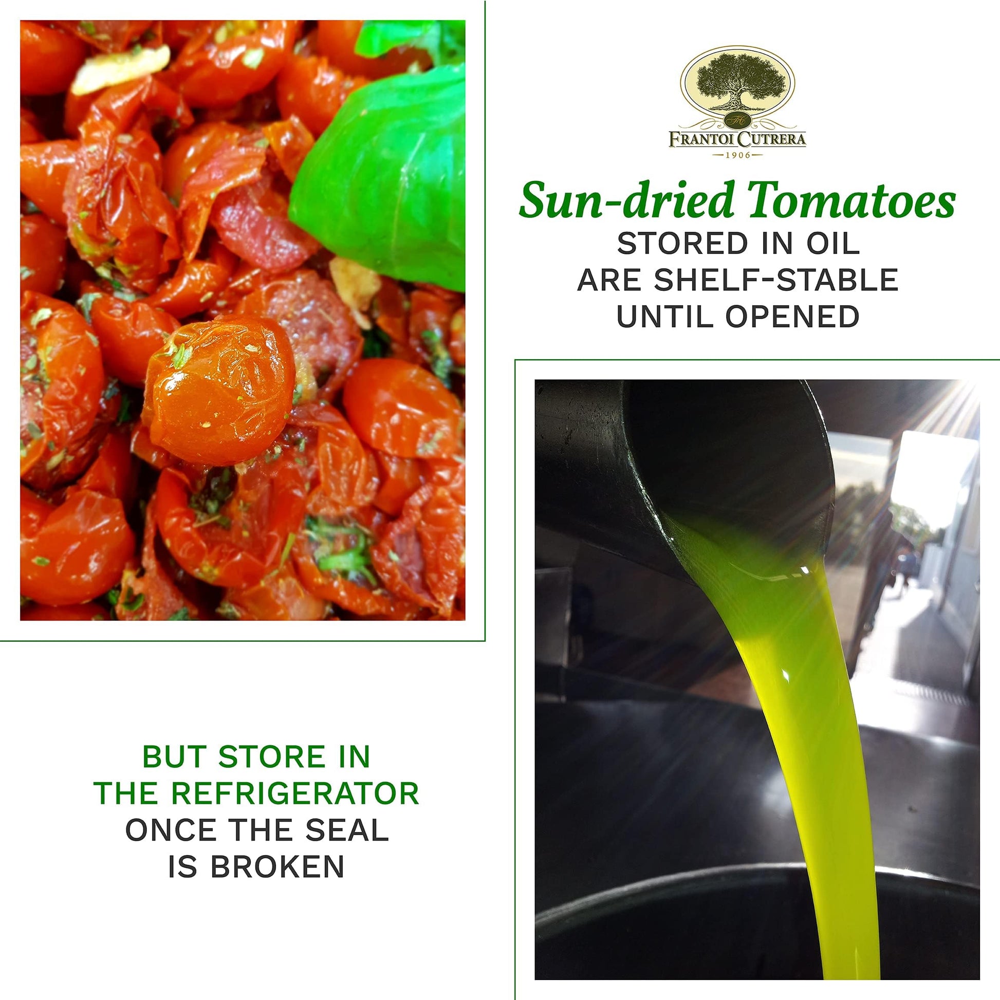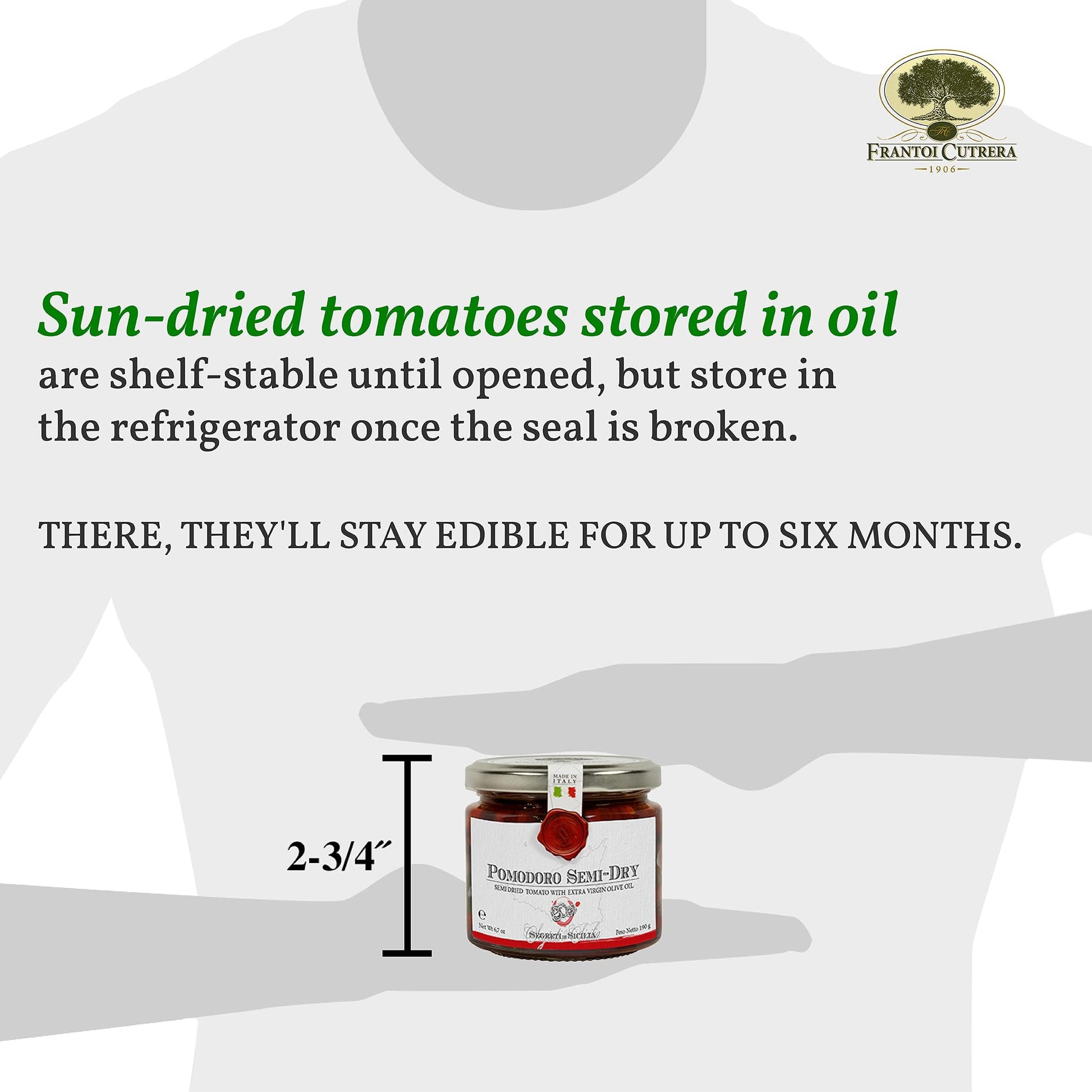 • Q: How should I store semi-dried cherry tomatoes in olive oil for optimal freshness? A: To maintain the best quality of Frantoi Cutrera semi-dried cherry tomatoes, store them in a cool, dark place, and once opened, refrigerate them in their olive oil. Make sure to keep them submerged in the oil to prevent spoilage. They can last for several weeks when stored properly.