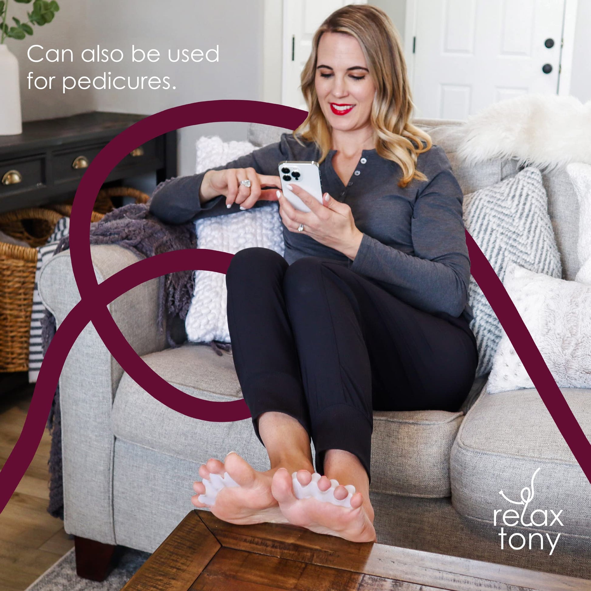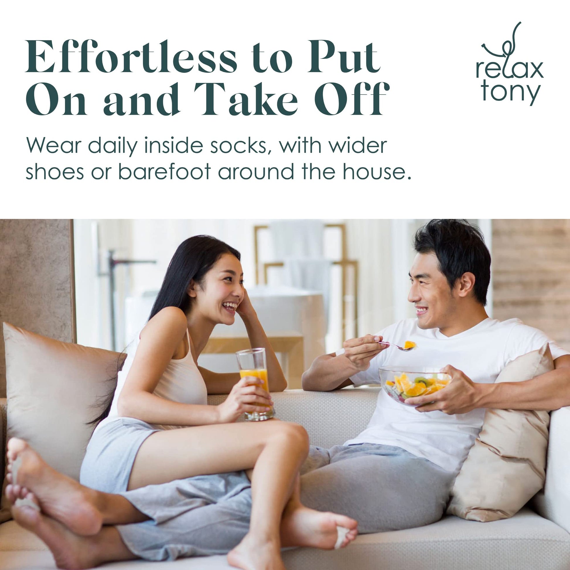 strong>YOU WERE BORN WITH PERFEcT FEETstrong> strong>Benefits of RelaxTony strong> ALIgN STRENgTHEN RESTORE strong>Why spread your toesstrong> Position toes back to their natural alignment Promote strengthening of intrinsic foot muscles Restore foot balance and proprioception Enable natural arch support Assist ankle and knee stability Provide proper distribution of body weight Eliminate common caused of foot pain Improve circulation to the end of the toes strong>Many uses for your RelaxTonystrong> MEDIcAL FITNESS WELLNESS & strong>Thousands of customers have used RelaxTonys Toe Spacers and made significiant progressstrong> I have bunion and was having trouble flexing my toes, but after the last 5 days wearing RelaxTony for 5 mins a day, Im able to bend my toes THIS WORKS - Elwina Stonehill The BEST $20 Ive spent in my life, saved me THOUSANDS from Bunion surgery -Mariah Ann Liggon After wearing RelaxTony for a few hours daily, my toes were straighter and more natural looking It felt uncomfortable at first and lesser overtime, its a good thing because it meant that im making progress - Pippa Newstead strong>Recommended by podiatrists and orthopedic surgeons as part of a comprehensive bunion treatment programstrong> I recommend RelaxTony Toe Seperators to all my patients It is the most effective Toe Spacer in the market today - Dr Phillip Bryant Excellent for treating Bunion, Overlapping and crooked Toes naturally - Dr Joe Lana strong>Use RelaxTony Daily And Start Seeing Resultsstrong> Begin wearing RelaxTony for 15 minutes per session and increase up to an hour At first, you may feel some soreness Just like with all exercise, thats normal