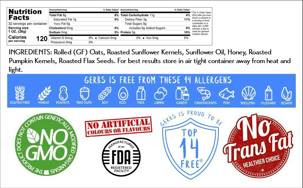 Gerbs Original 3 Seed Blend Granola includes roasted oats, sunflower seeds, pumpkin seeds, and brown flax seeds, lightly sweetened with honey. Great for snacking, breakfast, or as a topping. Packaged in resealable bags and prepared in Rhode Island using allergen-aware practices. Certified kosher.