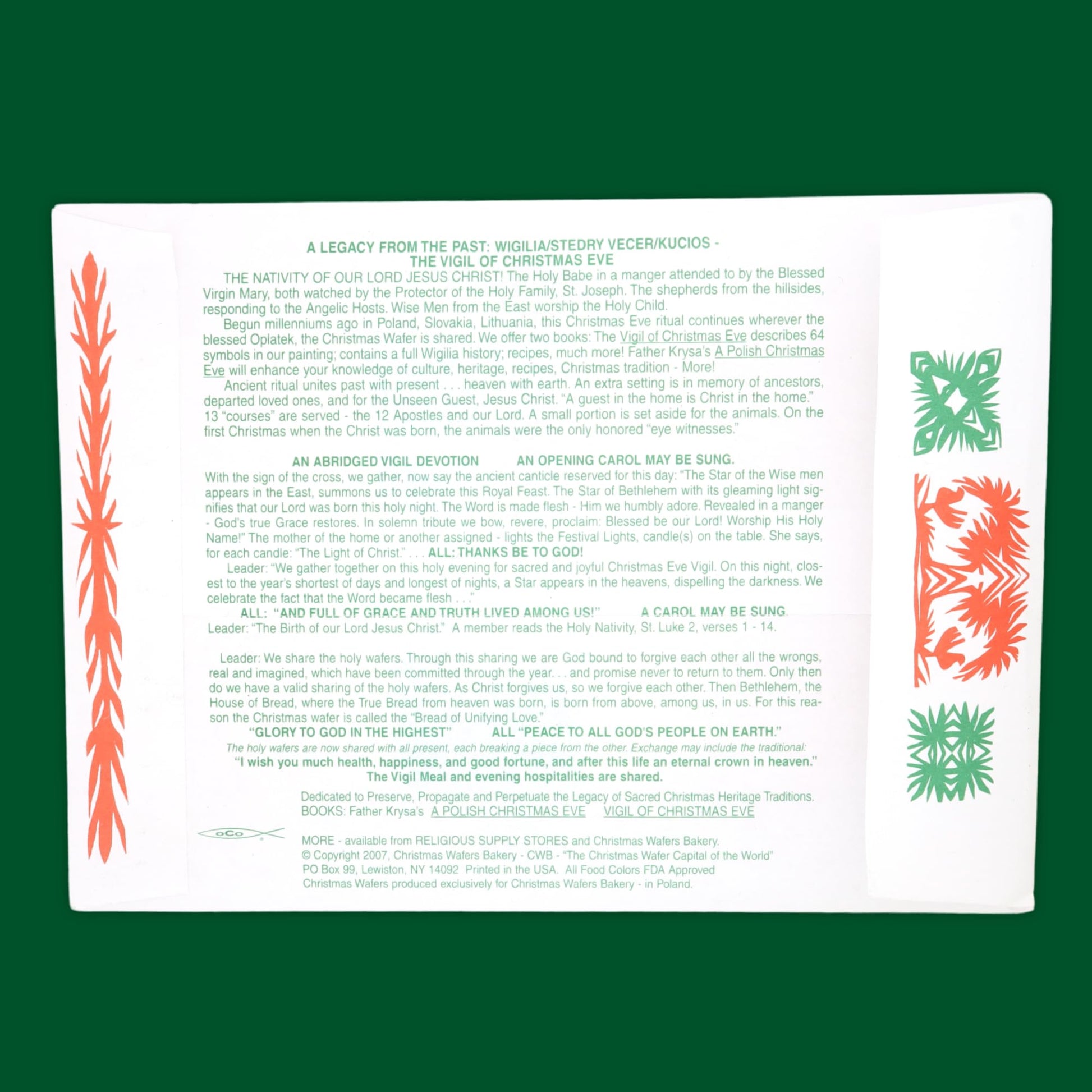 Experience The Cherished Tradition Of Oplatki With Our Meticulously Crafted Christmas Wafers, Originating From The Heart Of Poland. Symbolizing The Profound Concept Of The Bread Of Life, These Wafers Carry The Spiritual Significance Of Bethlehem, The ''House Of Bread,'' Where Our Savior Was Born. Gather Your Loved Ones Around The Table And Indulge In The Heartwarming Ritual Of Sharing Oplatki Wafers, Enjoyed By Families Worldwide Right Before The Christmas Eve Meal. Witness The Beautiful Exchange Initiated By The Eldest Family Member, As They Break Off A Piece Of The Christmas Wafer And Pass It Along With A Heartfelt Blessing, Expressing Unconditional Love For Each Family Member. Crafted With Care, Each Oplatki Wafer Boasts A Delicate Nativity Scene Imprint, Adding A Touch Of Reverence To This Cherished Tradition. As You Share In This Ritual, Experience The Spiritual Depth Of Oplatki, Mirroring The Unity And Love Shared During The Eucharistic Meal Celebrated By Catholics. Our Generous Set Includes Three Packs Of Four Oplatki Wafers-Comprising Nine White And Three Pink Wafers-Perfect For Enhancing Your Family Tradition And Celebration. Each Wafer Measures 3 1/2 Inches By 6 1/4 Inches, Ensuring Ample Portions For Your Gathering. Packaged In A Glory To God In The Highest Story Envelope, Our Oplatki Wafers Are A Testament To The Enduring Legacy Of Love, Unity, And Tradition. Made With Pride In Poland, They Invite You To Share In The Joy Of Family And The Boundless Love Of Christ.