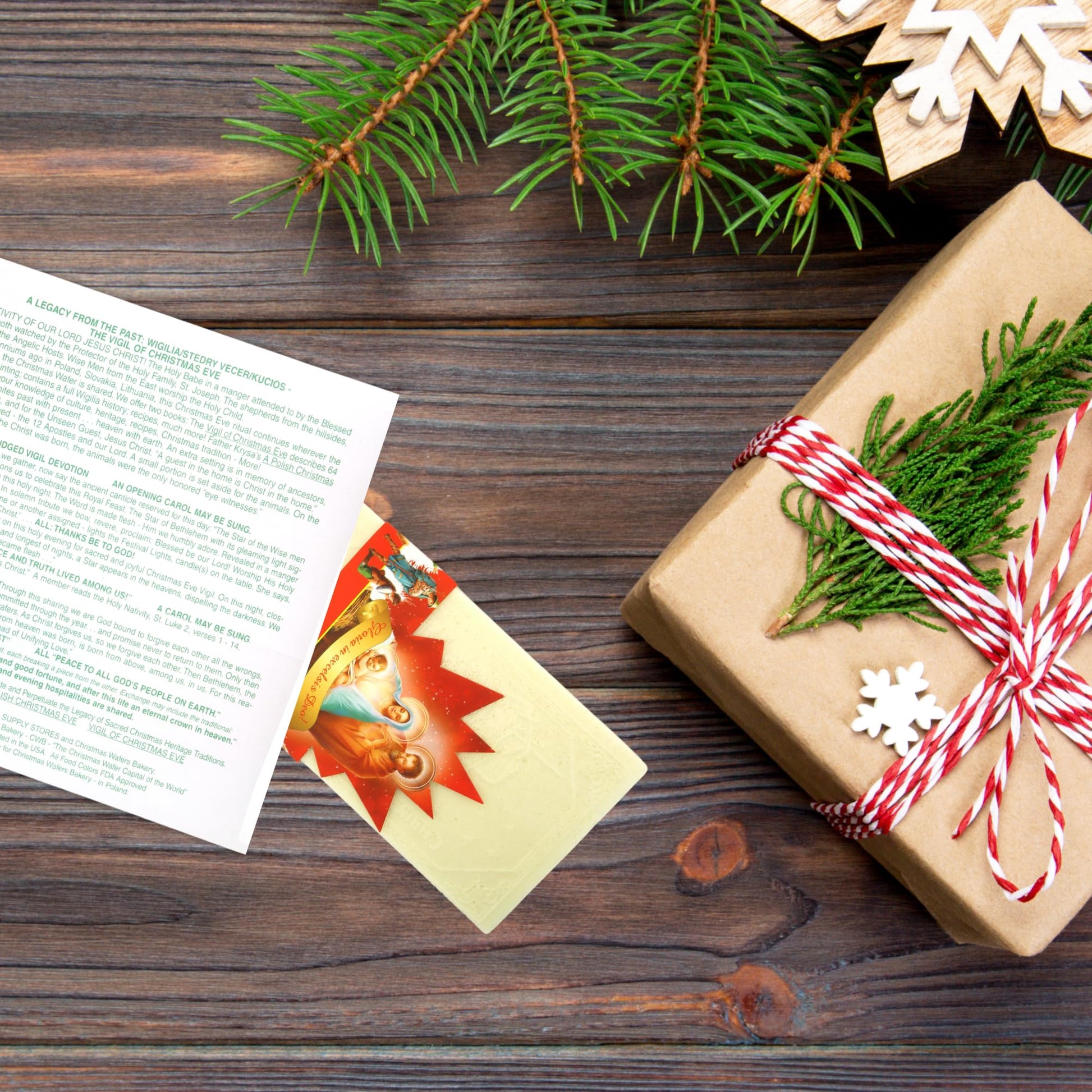 Q: Where are Oplatki wafers made and what is their packaging like?A: The Oplatki wafers are proudly made in Poland and are packaged in a 'Glory to God in the Highest Story Envelope,' which adds to their significance as a cherished family tradition.