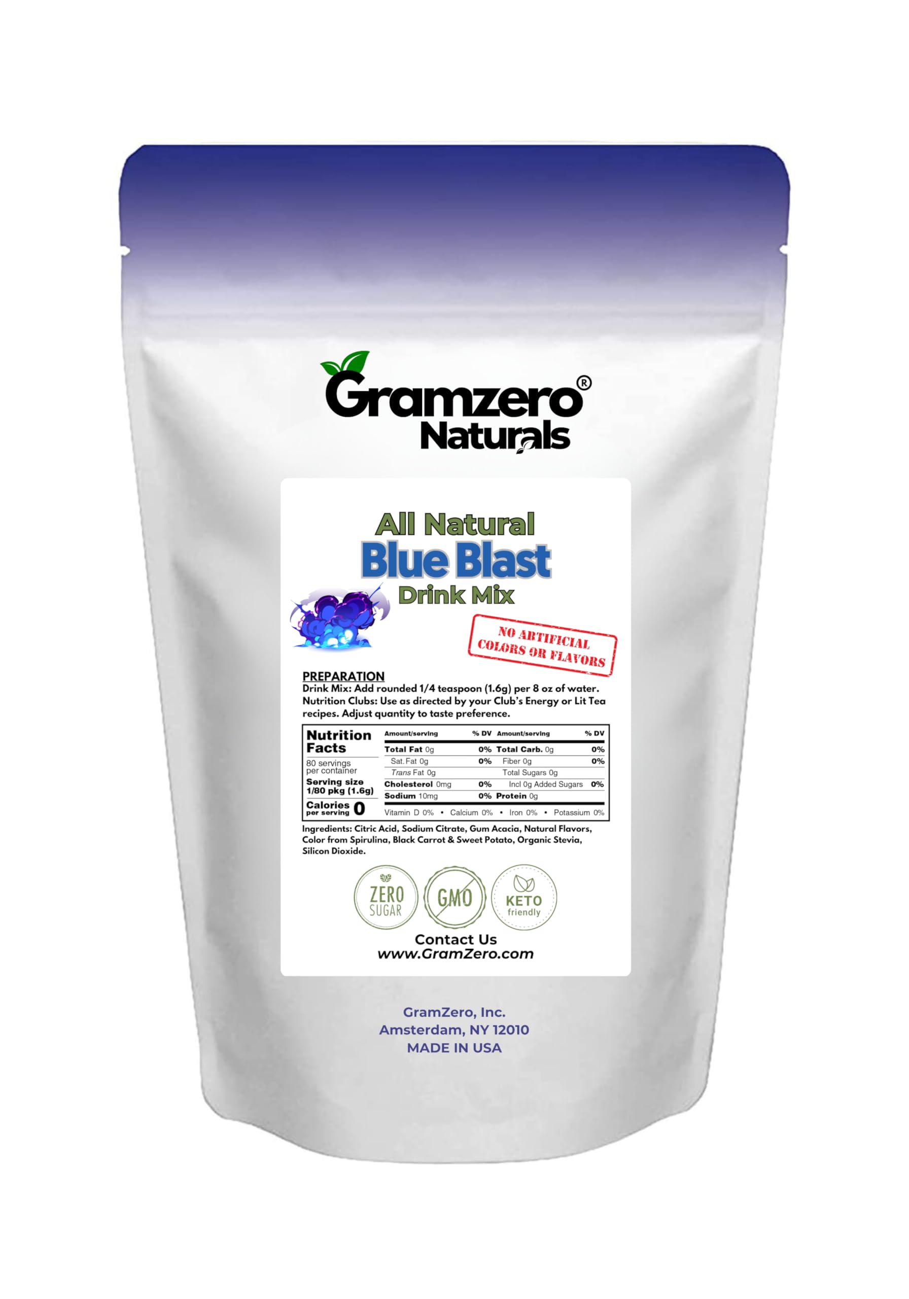 Q: What are the key ingredients in GramZero All Natural Blue Blast Drink Mix?A: GramZero All Natural Blue Blast Drink Mix is made with non-GMO ingredients, featuring all natural colors and flavors, and is sweetened with stevia, making it a great sugar-free option for health-conscious individuals.