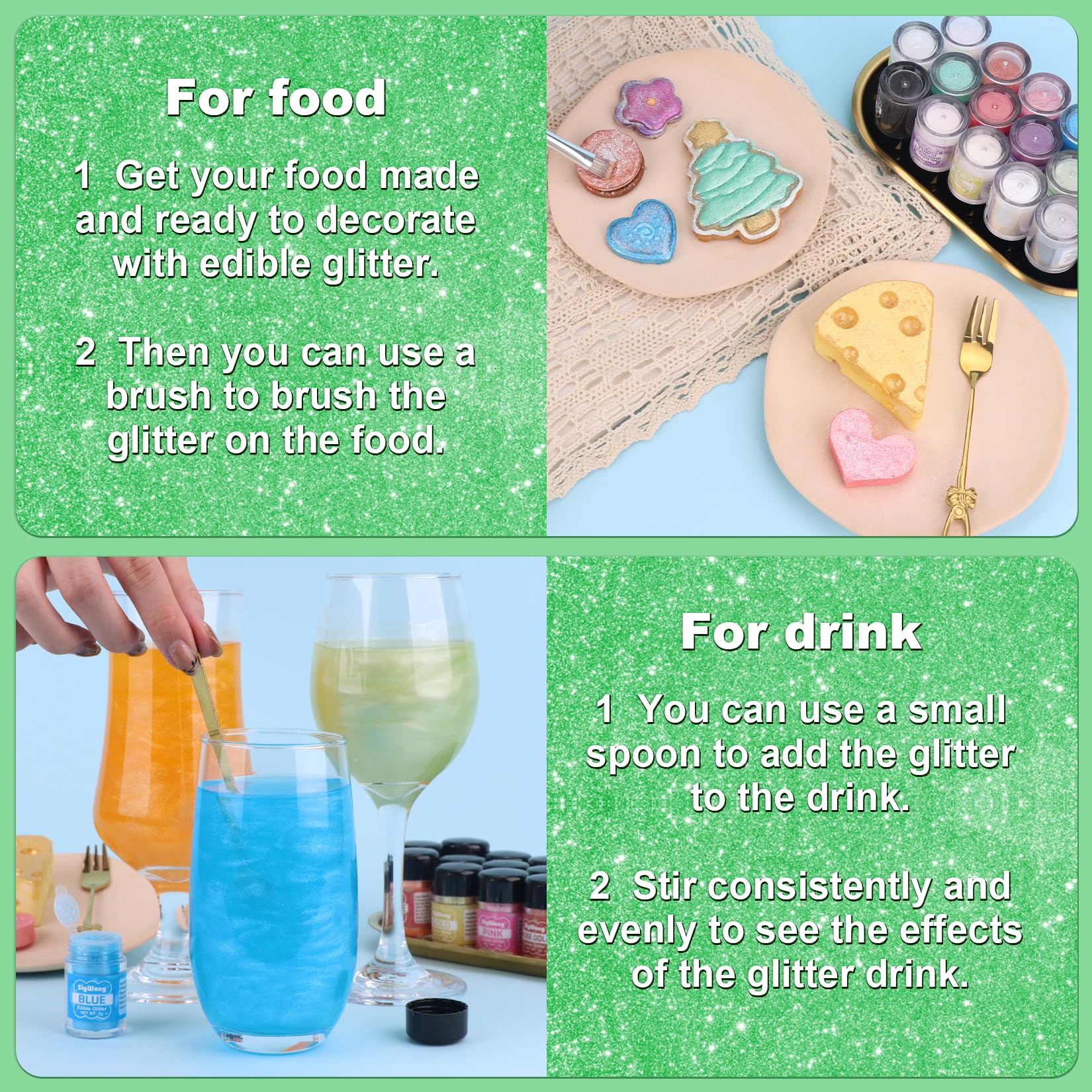Q: Can I use edible glitter for drinks?A: Absolutely! Our edible glitter is perfect for enhancing the appearance of drinks such as cocktails, champagne, and even soda. Just sprinkle a bit on top for a magical touch.
