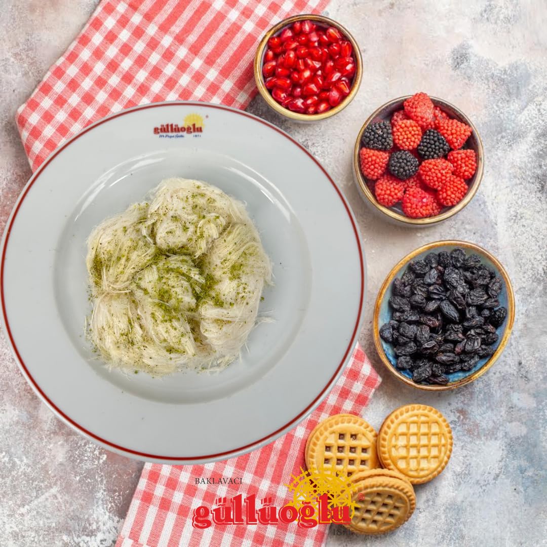 Q: What is Gulluoglu Candy Floss Pistachio and how is it made?A: Gulluoglu Candy Floss Pistachio, also known as Pişmaniye, is a traditional Turkish sweet made by blending flour roasted in butter with pulled sugar to create fine strands of cotton candy. It is prepared fresh upon order to ensure quality and flavor.