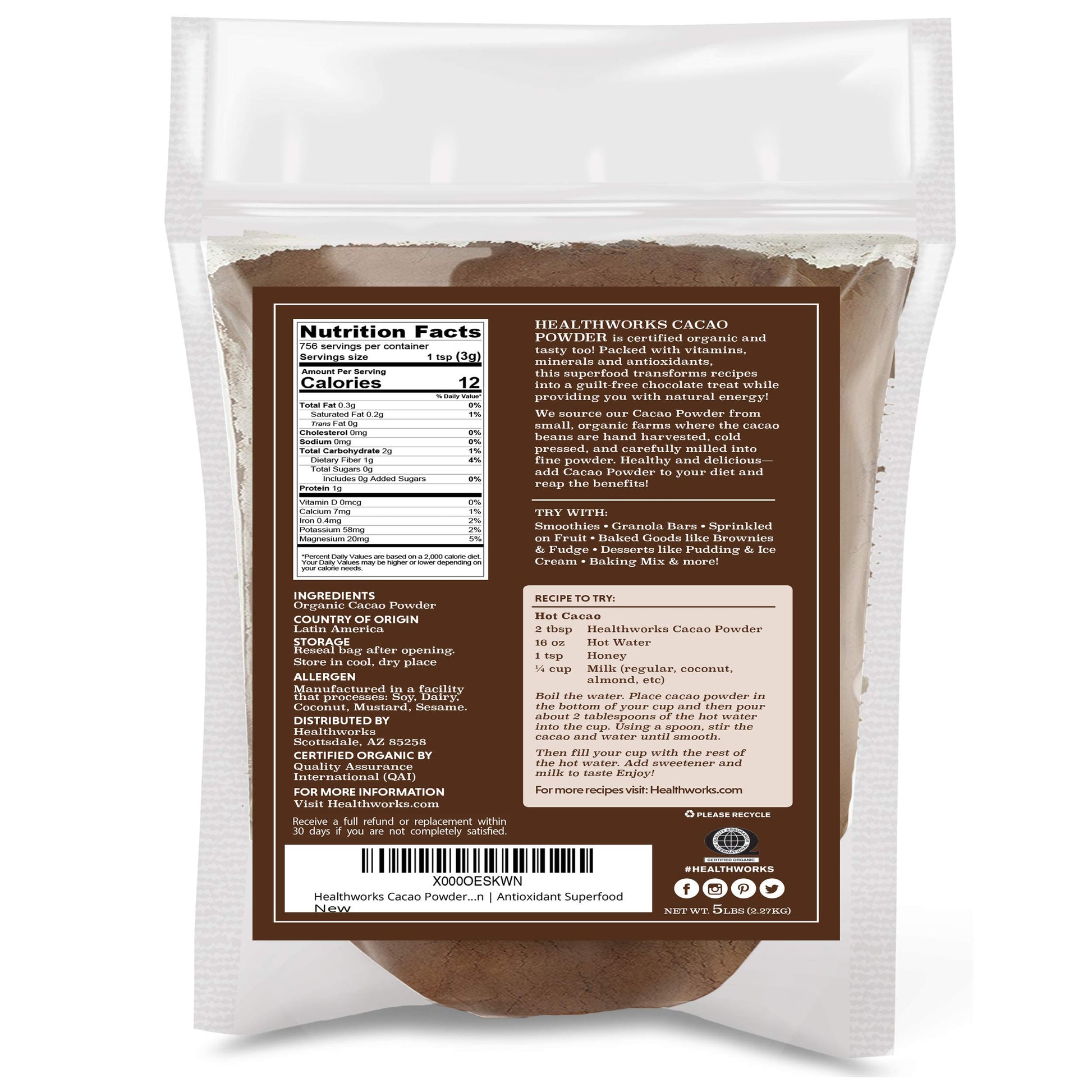 - Q: How can I use Healthworks Cacao Powder in my recipes? A: You can use Healthworks Cacao Powder in a variety of recipes, including smoothies, oatmeal, baked goods like brownies and cookies, and as a chocolate flavoring in yogurt or ice cream. It's a versatile ingredient that pairs well with coconut or almond milk.