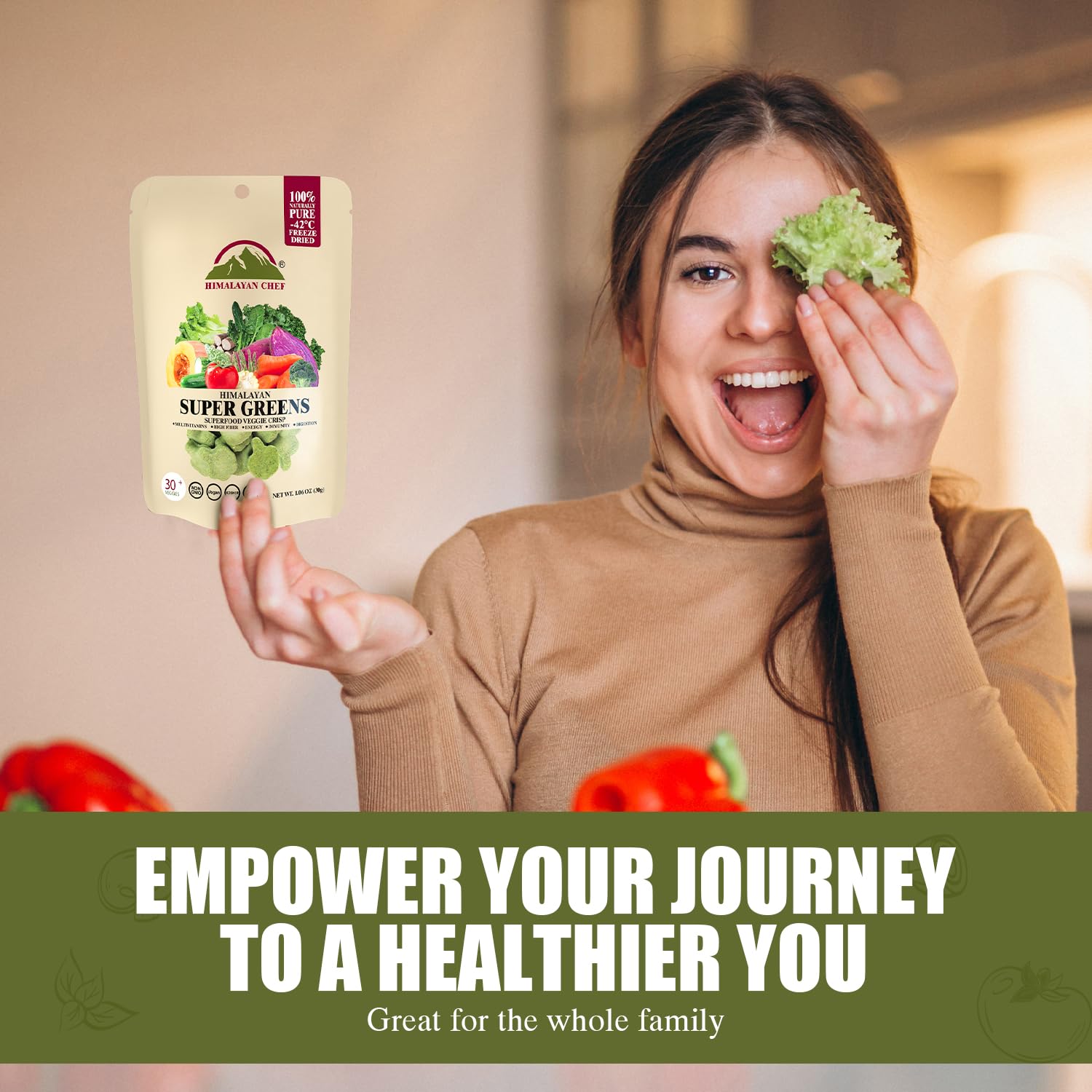 Q: What are the main ingredients in Himalayan Chef Super Greens Veggie Crisp?A: Himalayan Chef Super Greens Veggie Crisp is made from a mix of 30+ organic green vegetables, including nutrient-rich super greens. These freeze-dried veggie crisps contain no artificial additives and are gluten-free and non-GMO.