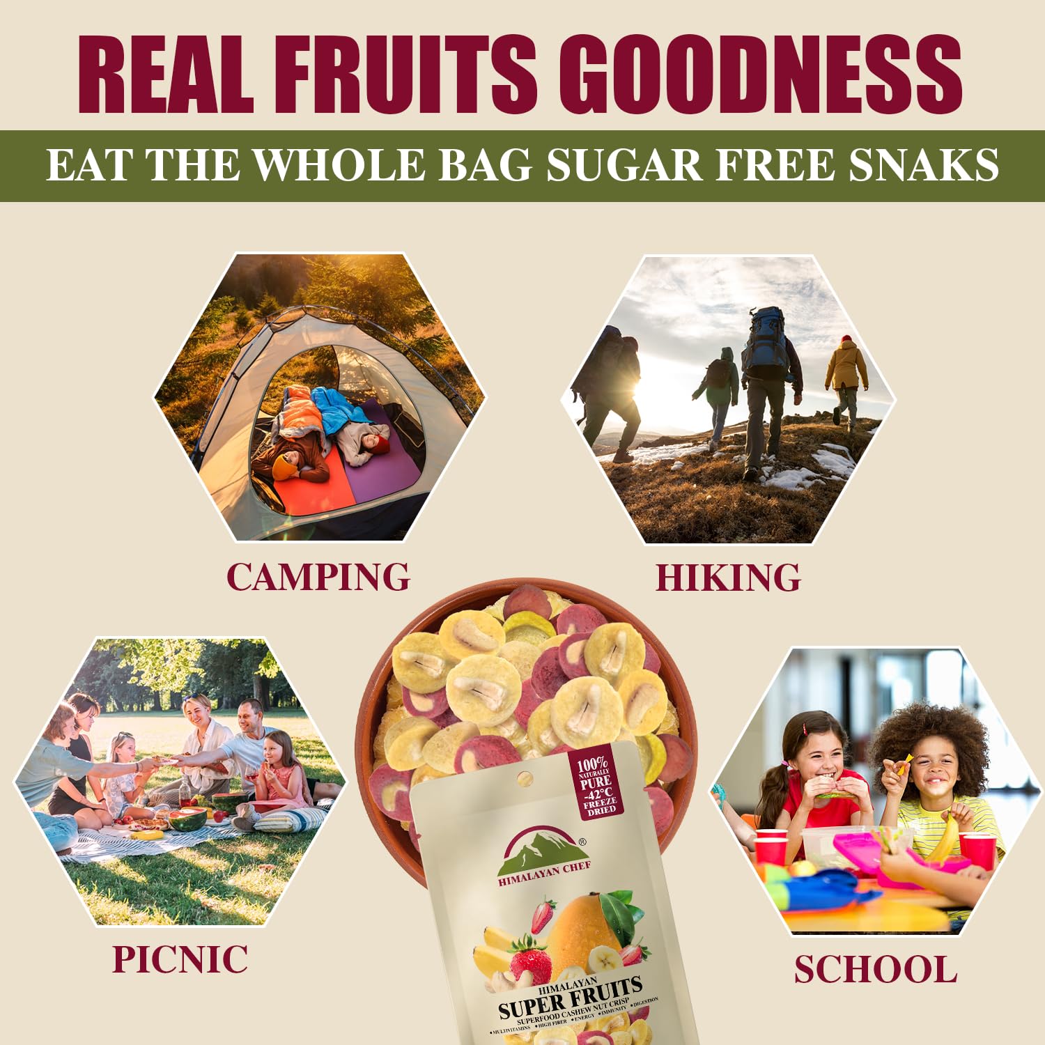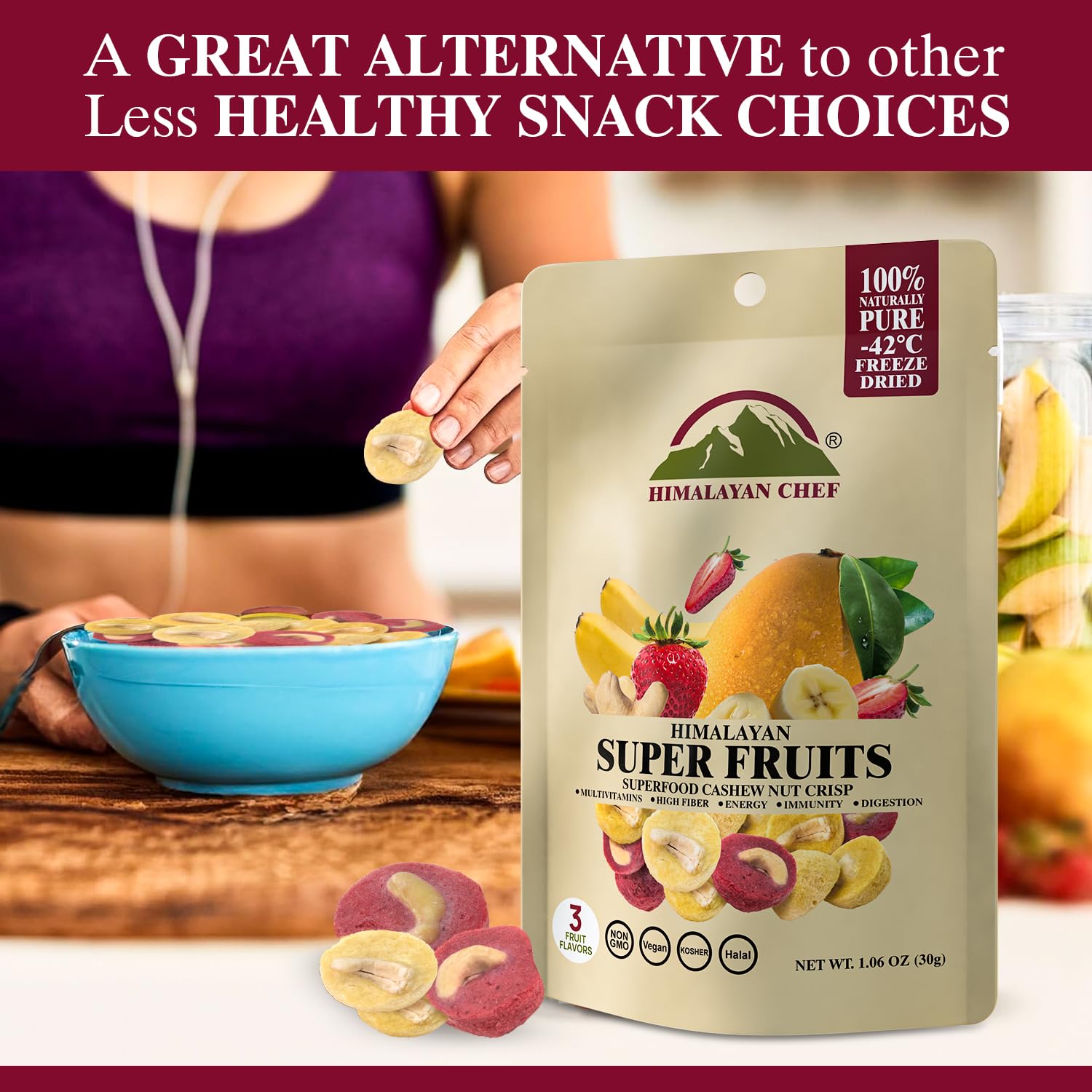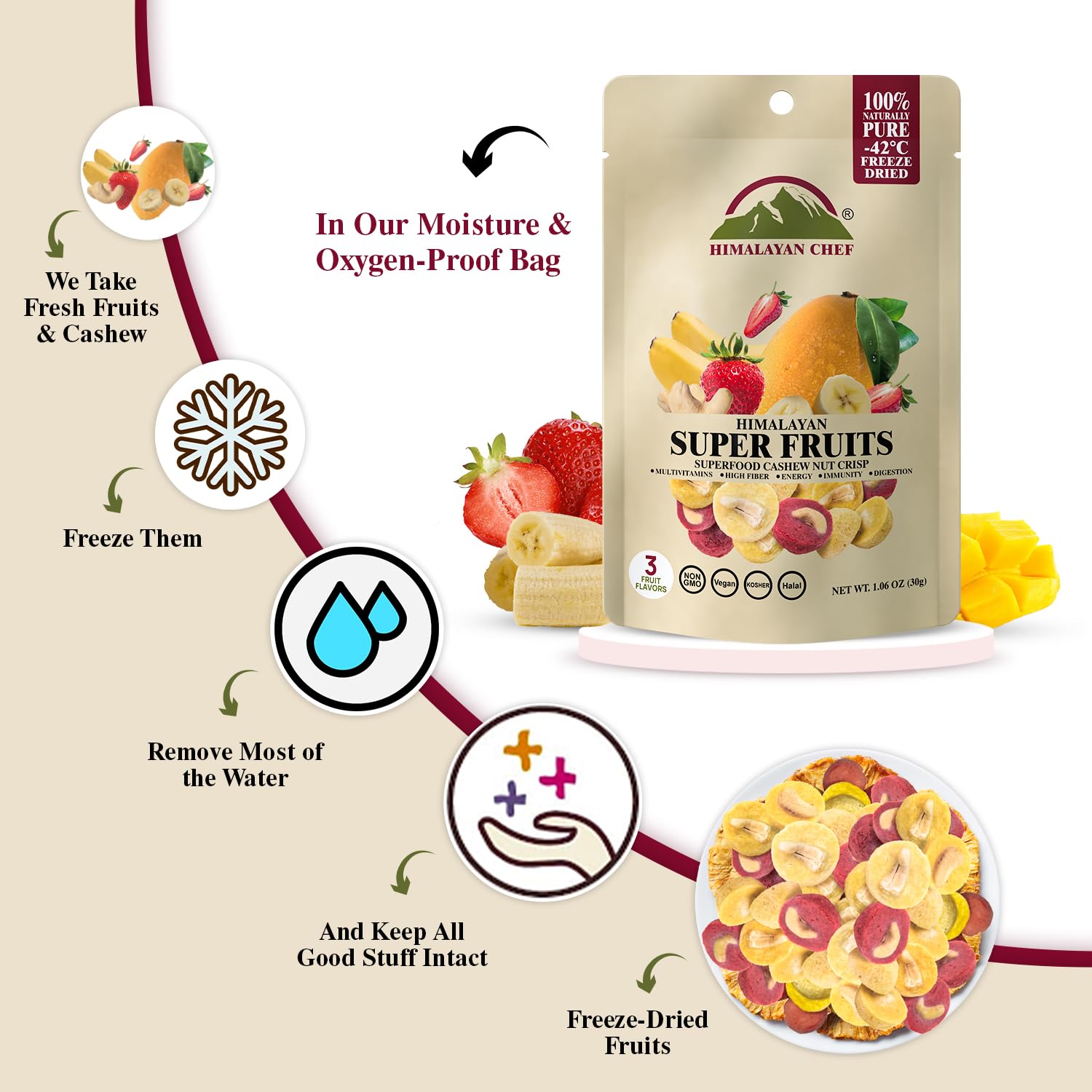 Q: What are the main ingredients in Himalayan Chef Super Reds Freeze-Dried Fruit Cashew Nut Crisps?A: Himalayan Chef Super Reds Crisps are made with a delightful mix of freeze-dried fruits including banana, strawberry, and mango, combined with crunchy cashew nuts for added flavor and texture.