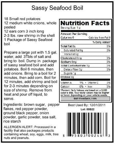 - Q: How do I prepare the seafood boil using the Sassy Seafood Boil? A: To prepare the seafood boil, fill a large pot with 1.5 gallons of water and add 3 tablespoons of salt. Bring the water to a boil, then add the package of Sassy Seafood Boil and 18 small red potatoes. After boiling for 6 minutes, add 12 whole peeled medium white onions, boil for 2 minutes, then add 12 ears of corn. Finally, add 2-3 lbs of raw shrimp and boil for an additional 2-3 minutes, depending on the size of the shrimp.
