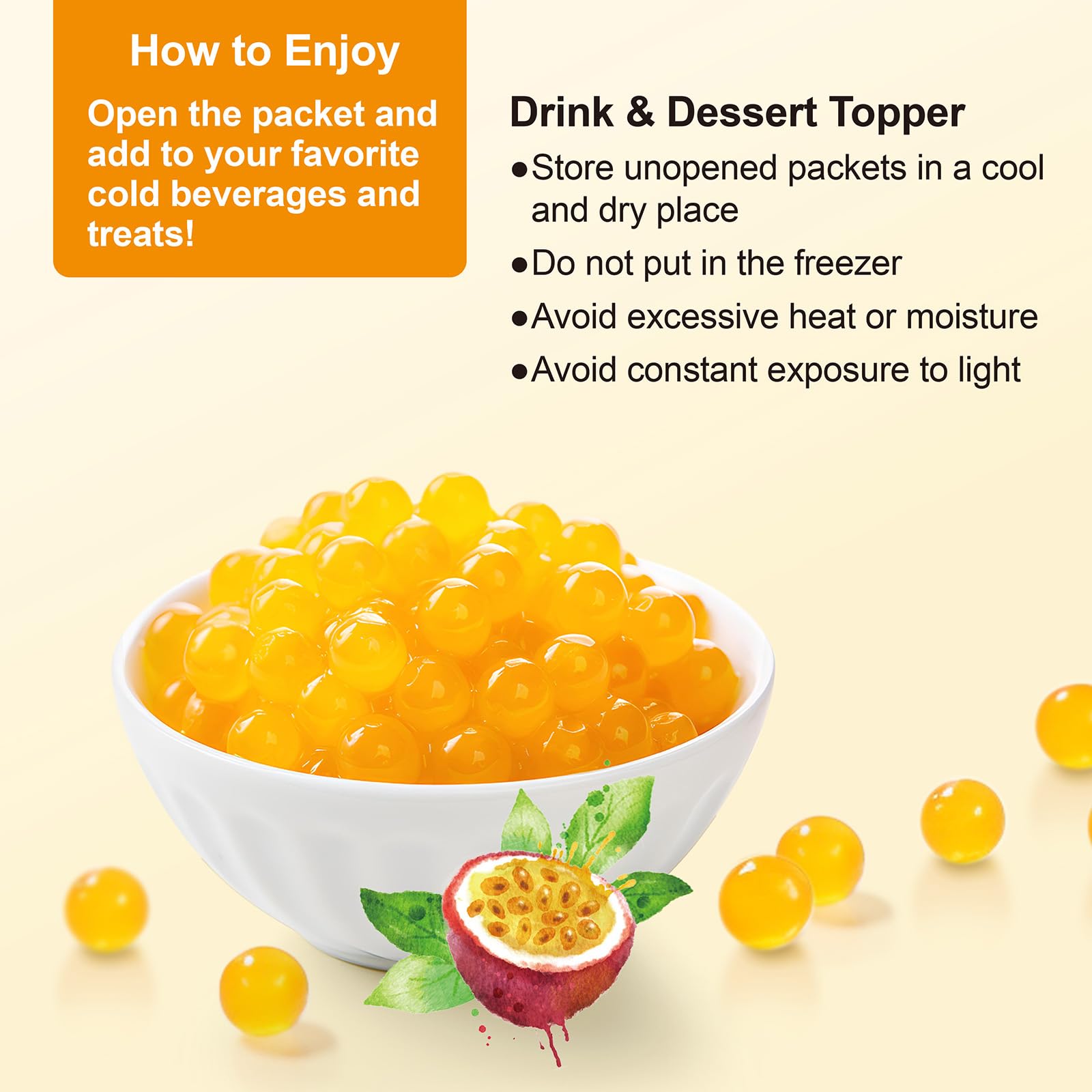 Q: How do I use popping boba in drinks and desserts?A: Popping boba can be used as a fun topping for bubble tea, smoothies, frozen yogurt, ice cream, and desserts like cakes and waffles. Simply open the container and add the boba pearls to your favorite beverages or sweets for a burst of flavor and texture.