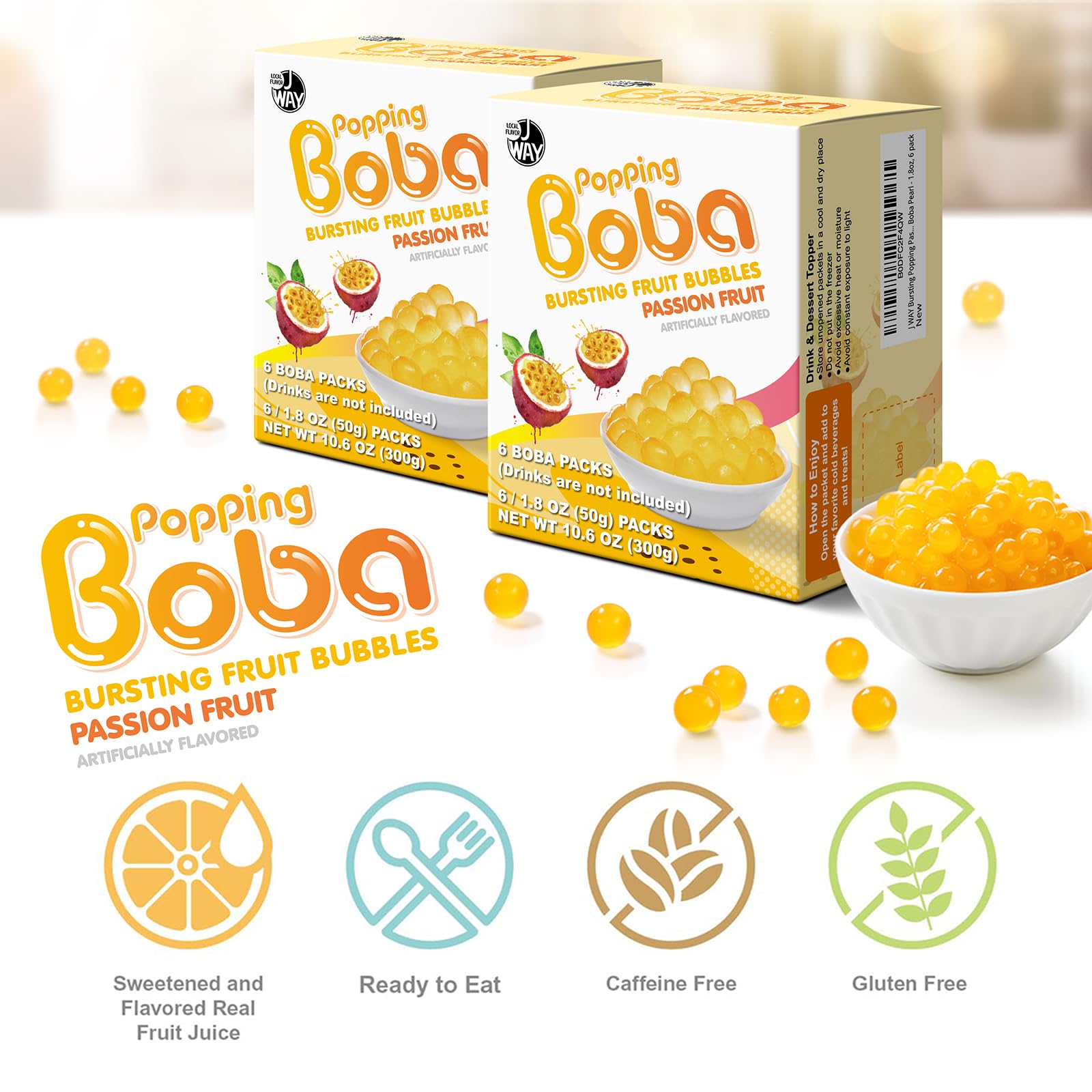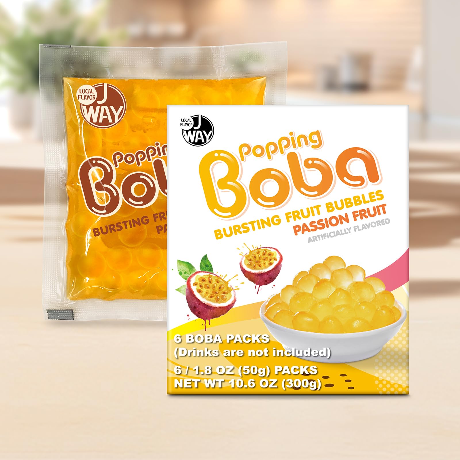 Q: What are J WAY Bursting Popping Passion Fruit Boba Pearls made of?A: J WAY Bursting Popping Passion Fruit Boba Pearls are crafted from real fruit juice, providing a delicious burst of fresh passion fruit flavor with every bite. These pearls are gluten-free, fat-free, and vegan-friendly, making them suitable for various dietary preferences.
