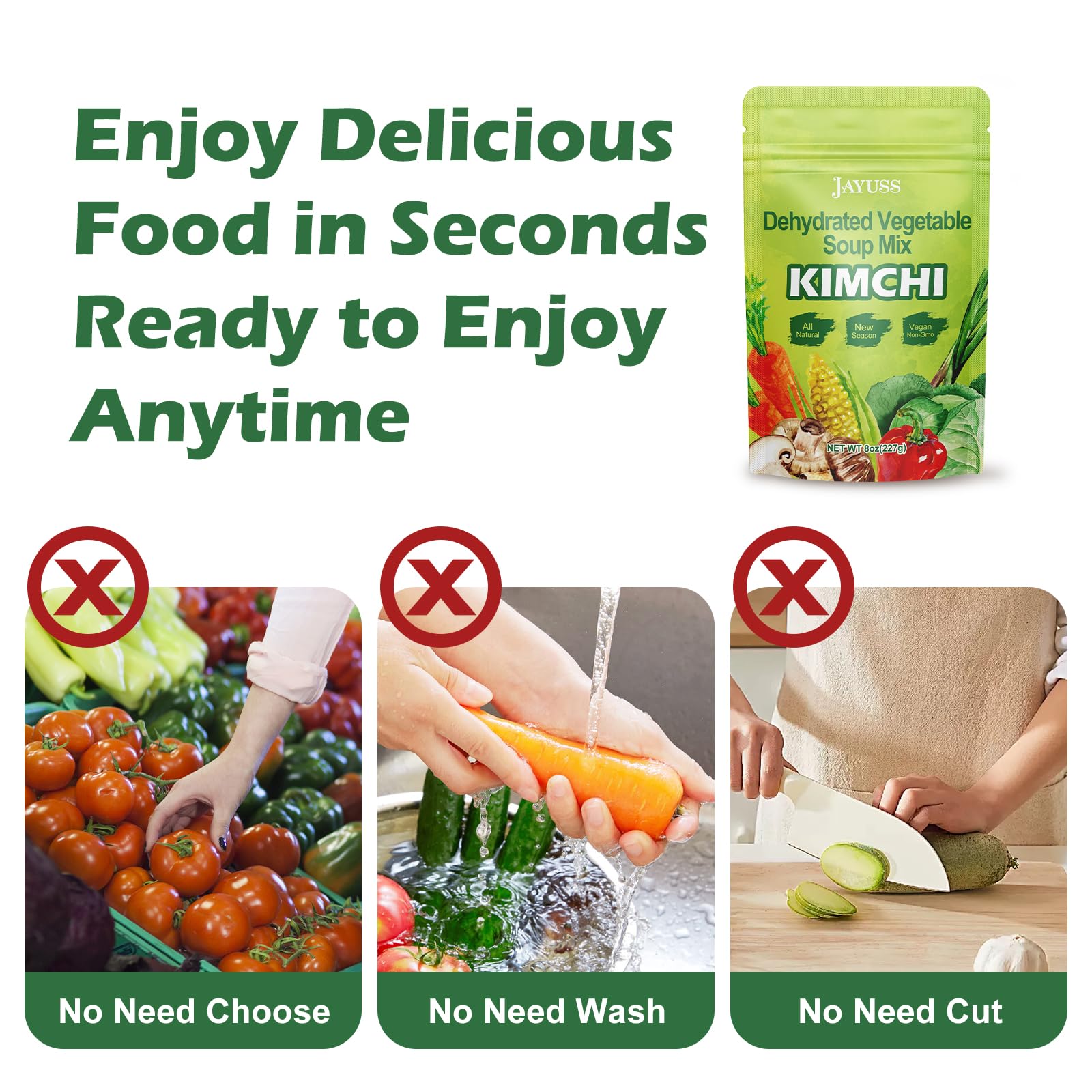- Q: What are JAYUSS Ramen Toppings Dehydrated Kimchi Vegetable Flakes made of? A: JAYUSS Ramen Toppings Dehydrated Kimchi Vegetable Flakes are made from a carefully selected blend of delicious seasonal vegetables including carrot, cabbage, kimchi, corn, sweet red pepper, green shallots, and shiitake mushroom. They are all natural, gluten-free, and non-GMO.