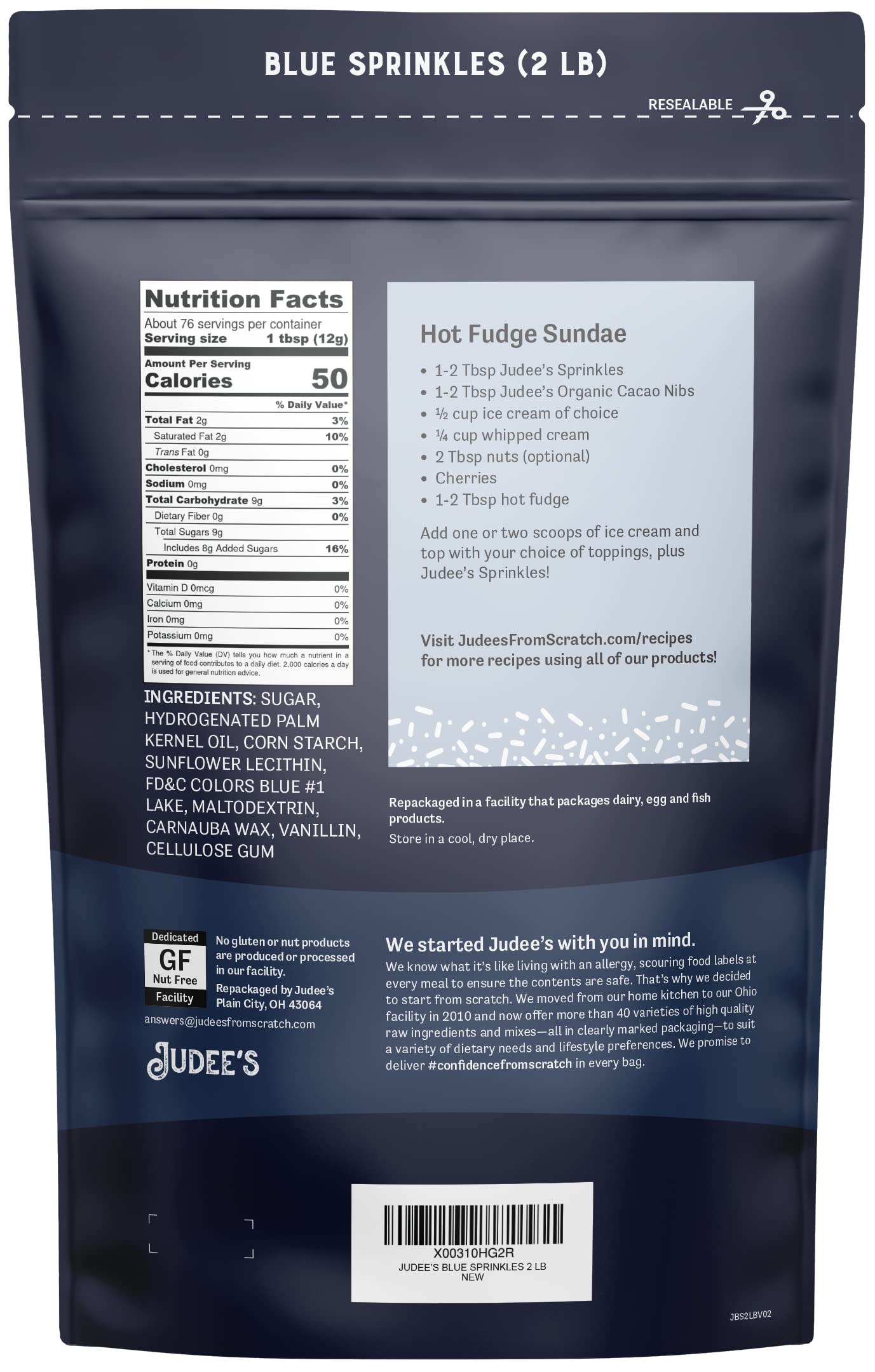 - Q: Are these sprinkles made with gluten-free ingredients? A: Yes, Judee's Blue Sprinkles are made with gluten-free ingredients, including sugar and various colorings, ensuring they are safe for those with gluten sensitivities or celiac disease.