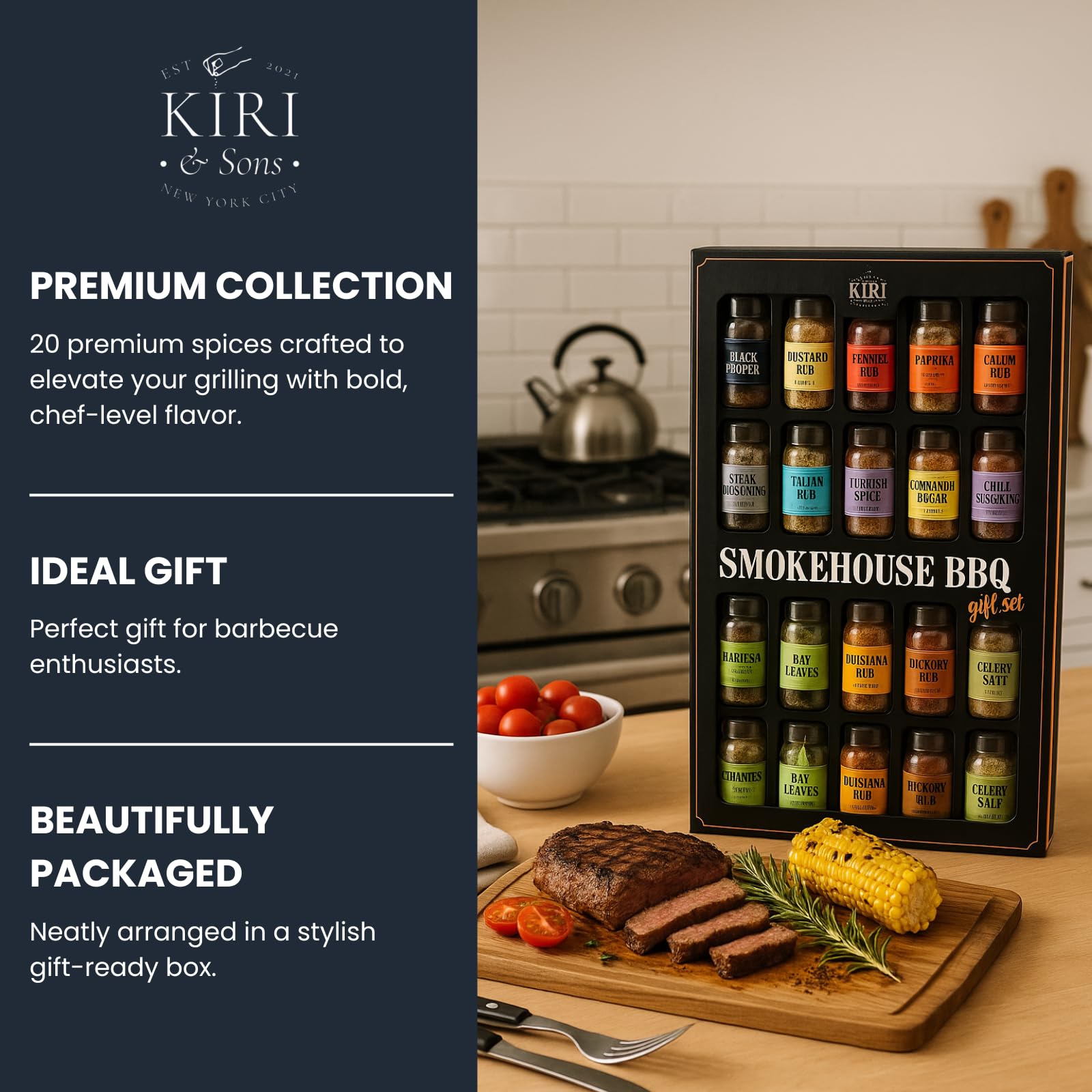 - Q: How many spice bottles are included in the set? A: The Kiri & Sons BBQ Spice Set includes 20 glass bottles of gourmet grilling spices. Each bottle is perfectly portioned, allowing you to experiment with new recipes or add a twist to your favorite dishes.