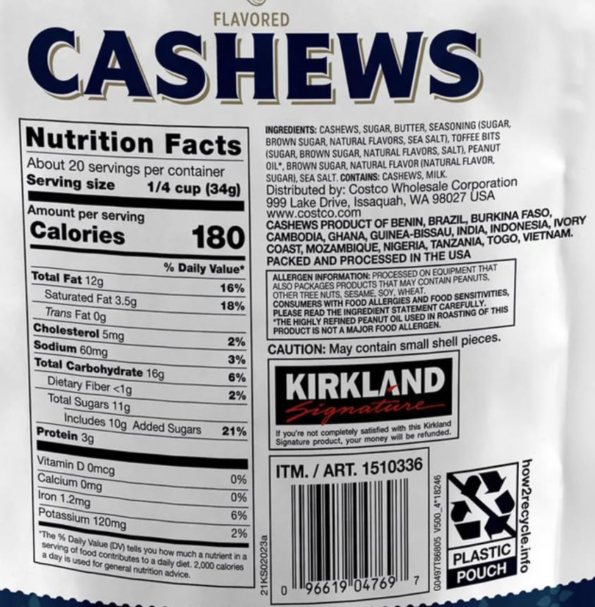 - ? Bundle Offer: Enjoy a fantastic value with 1 package of Kirkland Signature Butter Toffee Flavored Cashews and a complimentary collapsible cup (200 ml).