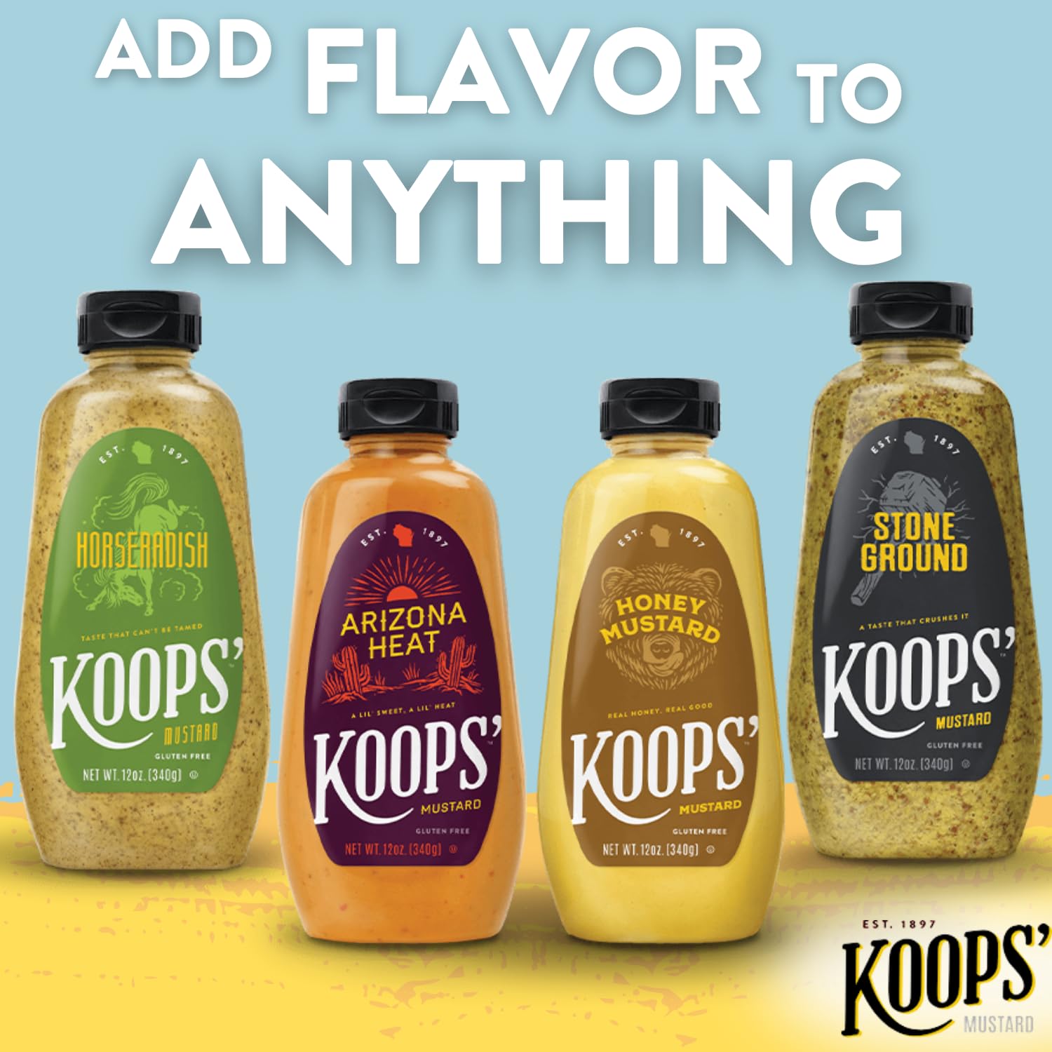For Koops' Fan Favorites Variety Pack, We Brought Together An Assortment Of Our Best-Loved Mustards. Each Pack Includes One Sweet And Hot Arizona Heat, One Bold Horseradish, One Robust Stone Ground And One Sweet Honey To Complement Your Favorite Dishes. Each Delicious Flavor Is Certified Gluten-Free And Certified Ou Kosher. Our Fan Favorites Mustard Variety Pack Contains Four 12 Oz. Bottles. Koops Isnt Your Ordinary Mustard. Its Extraordinary Mustard. With Fourteen Bold Flavors That Can Satisfy Any Appetite, It Makes Good Food Great And Great Food Amazing. Made In Wisconsin. Enjoyed Everywhere.