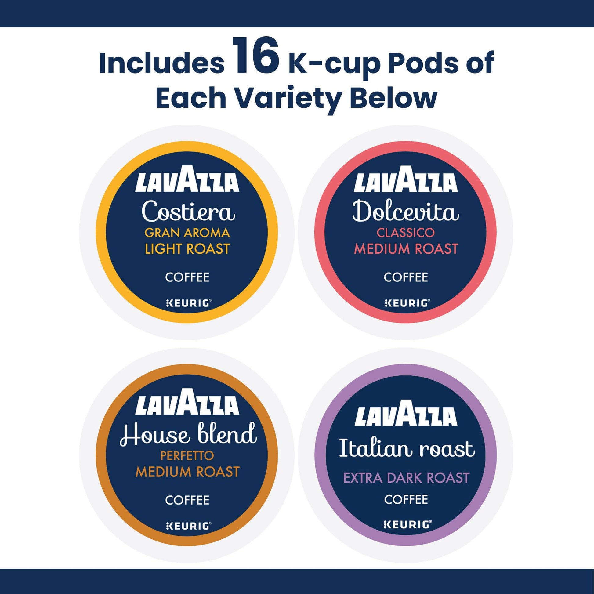 - Q: What types of coffee blends are included in the Lavazza Coffee Variety Pack? A: The Lavazza Coffee Variety Pack includes four different blends: 16 K-cup pods of Lavazza Costiera (Gran Aroma Light Roast), 16 K-cup pods of Lavazza Dolcevita (Classico Medium Roast), 16 K-cup pods of Lavazza House Blend (Perfetto Medium Roast), and 16 K-cup pods of Lavazza Italian Roast (Extra Dark Roast).