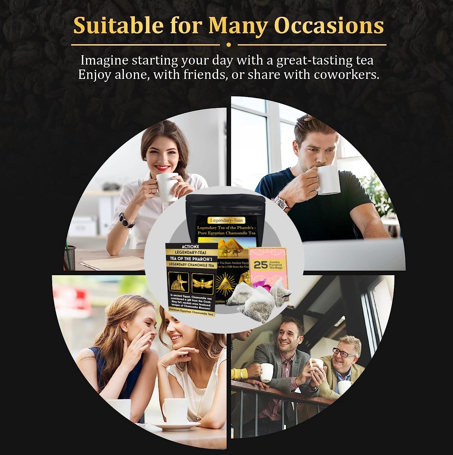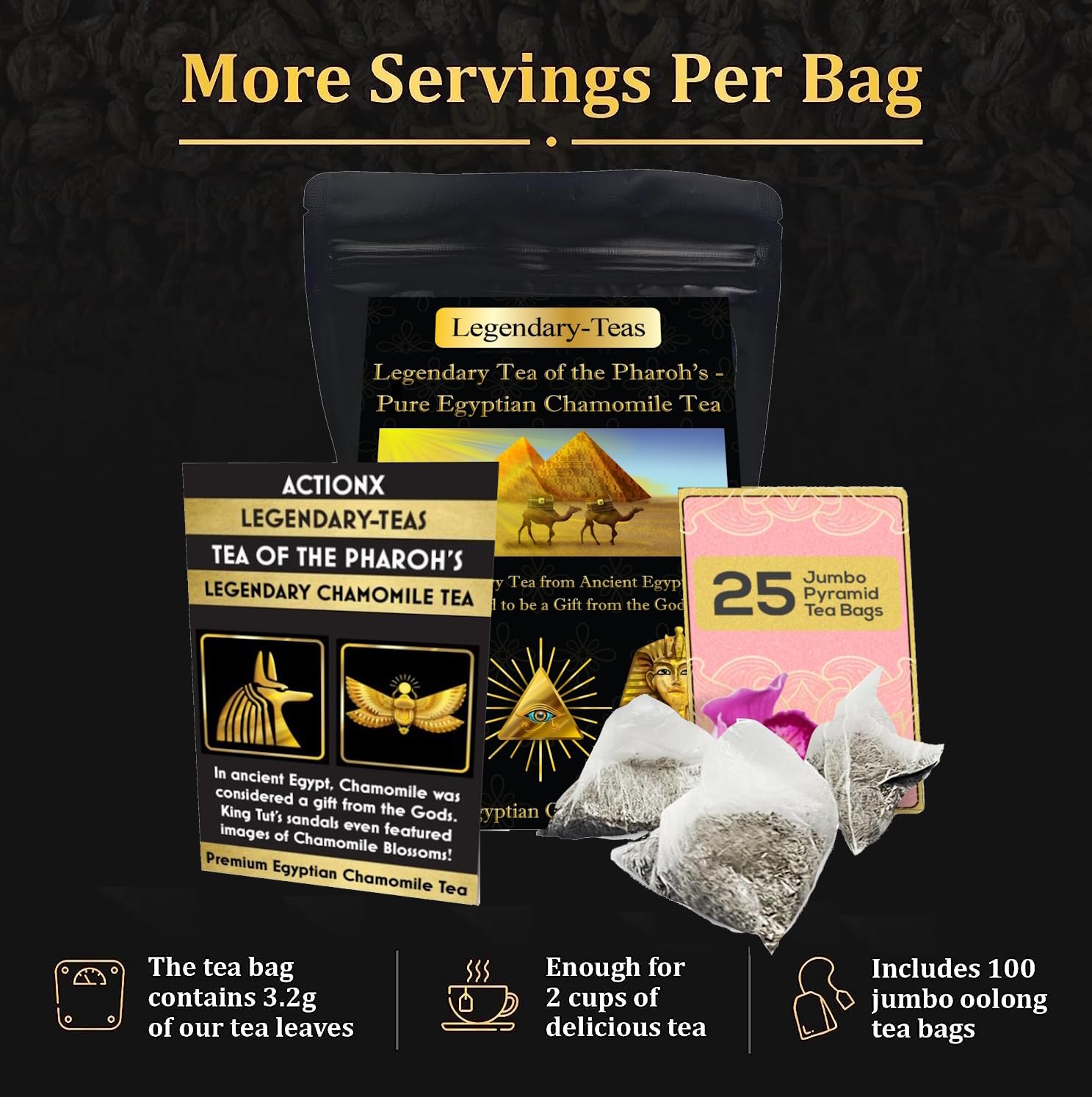Legendary-Teas Tea Of The Pharaoh'S Pyramid Tea Bags In A 25 Pack Gift Pouch - Egyptian Chamomile Tea Is A Traditional Beverage Surrounded By Legends.Chamomile Was Used To Enhance Positive Energy And To Bring Emotional And Spiritual Balance. Unlike Some Herbs That Simply Repel Negative Energy, The Chamomile Flower Is Believed To Transform The Negative Energy Into Positive Energy. It Is Still In Use Today For Similar Beliefs. A Generous Supply Of This Exquisite Tea Can Be Found In Our Specially Designed Gift Box. Thus, If Youre Looking For Premium Herbal Chamomile Tea For Personal Consumption Or Sharing With Loved Ones, Youve Come To The Right Place. The Legendary-Teas Tea Of The Pharaoh'S Pyramid Tea Bags In A 25 Pack Gift Pouch From Actionx Is As Amazing As The Benefits Of The Tea. This Gift Pouch Has An Elegant Black And Gold Motif To Match The Fine Traditional Tea Contained Within. It'S Decorated With Beautiful Egyptian Artwork And Features A Flyer Describing The Benefits, Making It An Interesting Present For Tea Enthusiasts And An Interesting Display Pouch For The 25 Pyramid Teabags It Contains. To Make Our Chamomile Tea Luxurious, We Follow A Traditional Recipie To Bring Out Their Natural Aroma And Unique Taste. Our Tea Leaves With Amazing Floral Notes And Aroma Are Packed In Non-Woven, Plant-Based Teabags So You Can Put Them In The Compost Bin After Infusion. Each Teabag Contains 1.2G Of Our Tea Leaves, Enough To Yield Two Cups. To Maintain Freshness, Our Teabags Are Vacuum-Sealed In Foil Pouches. More To Know About Our Natural Tea Box: - Lasts For 10 Years When Unopened; 2 Years Once Opened - Non-Gmo Tea Manufactured According To Industry Standards For Quality - Reseal The Pouches And Keep Away From Strong Scents Treat Yourself!