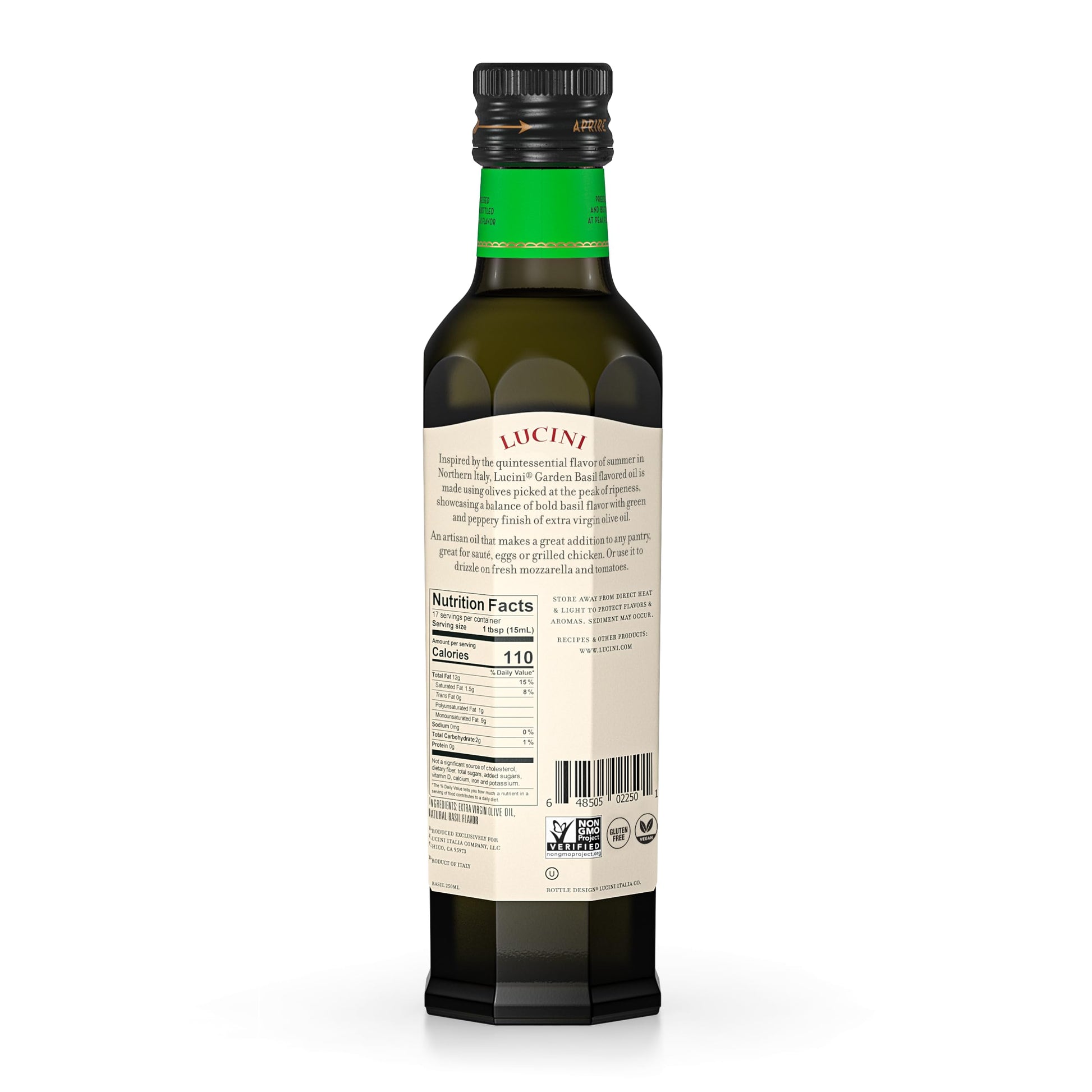 Q: What are the main flavors of Lucini Garden Basil Extra Virgin Olive Oil?A: Lucini Garden Basil Extra Virgin Olive Oil features a fresh and herbaceous flavor profile, thanks to the essential oil of fresh basil blended with premium select extra virgin olive oil.