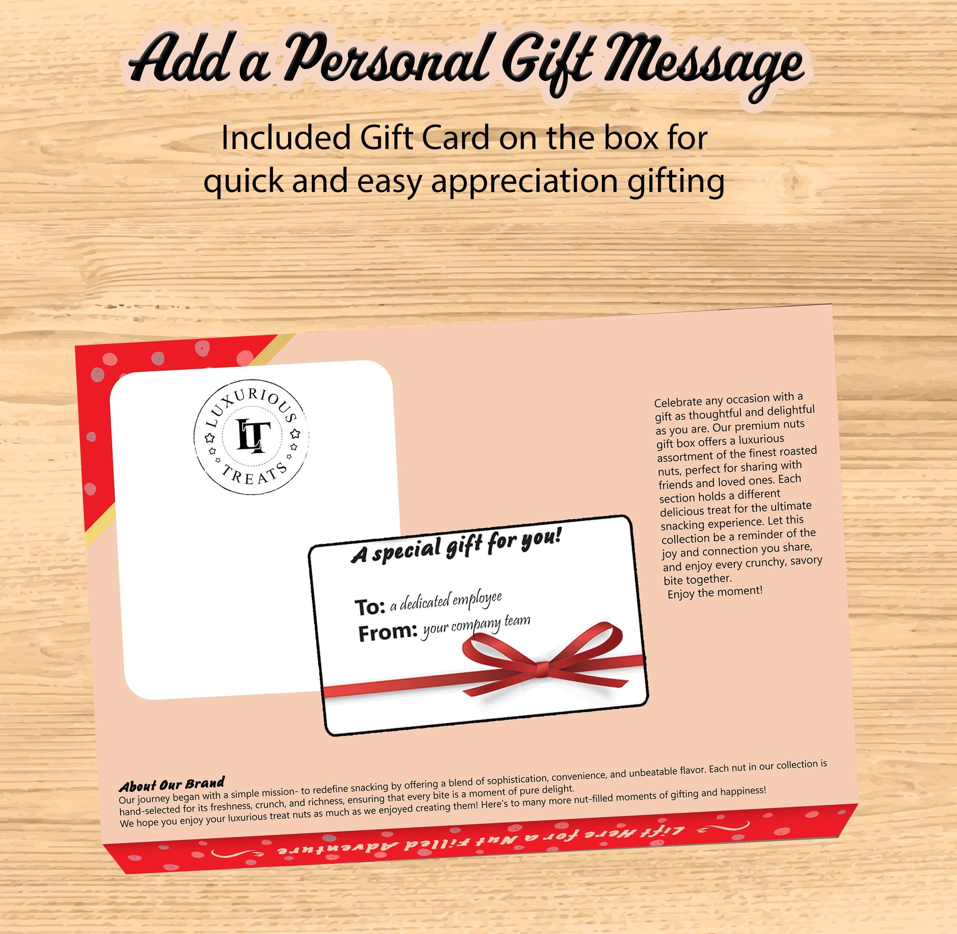 - Q: Can I send the gourmet nut gift box as a corporate gift? A: Absolutely! The beautifully arranged Nuts Thank You Gift Box is perfect for corporate gifting. It’s a great way to show appreciation to employees or clients, and you can receive business pricing when purchasing multiple sets.