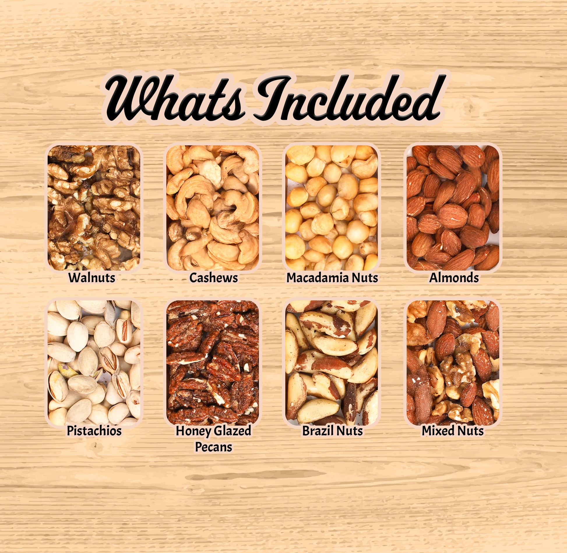 - Q: What types of nuts are included in the Luxurious Treats Fathers Day Gourmet Dad Treats gift basket? A: The Luxurious Treats gift basket features a delicious assortment of gourmet nuts, including roasted salted cashews, roasted salted almonds, walnuts, pecans, unique brazil nuts, pistachios, and a mix of other roasted salted nuts. This diverse selection ensures there's something for every nut lover.