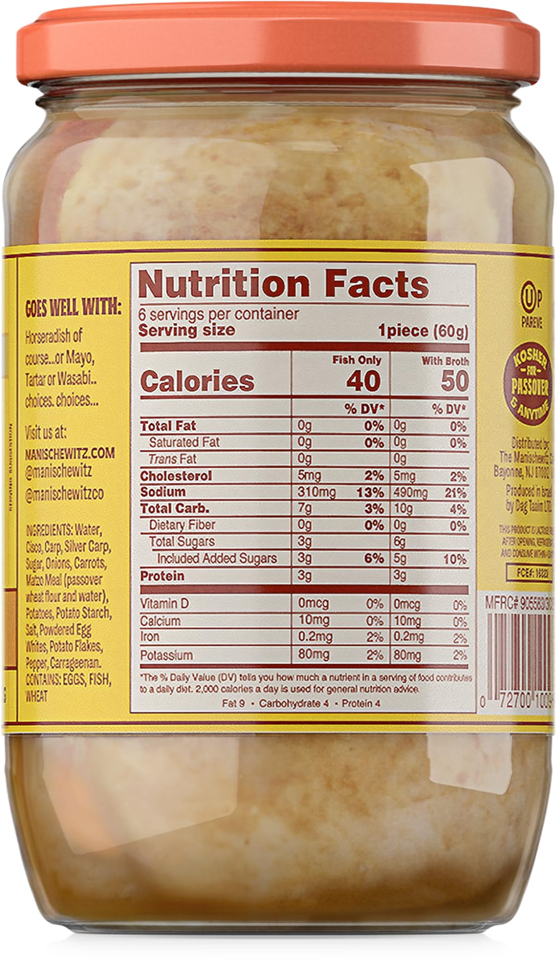 Q: What is Manischewitz Premium Gold Gefilte Fish made from?A: Manischewitz Premium Gold Gefilte Fish is crafted from the finest ingredients, ensuring a flavorful and traditional taste that you can enjoy during Passover and throughout the year.