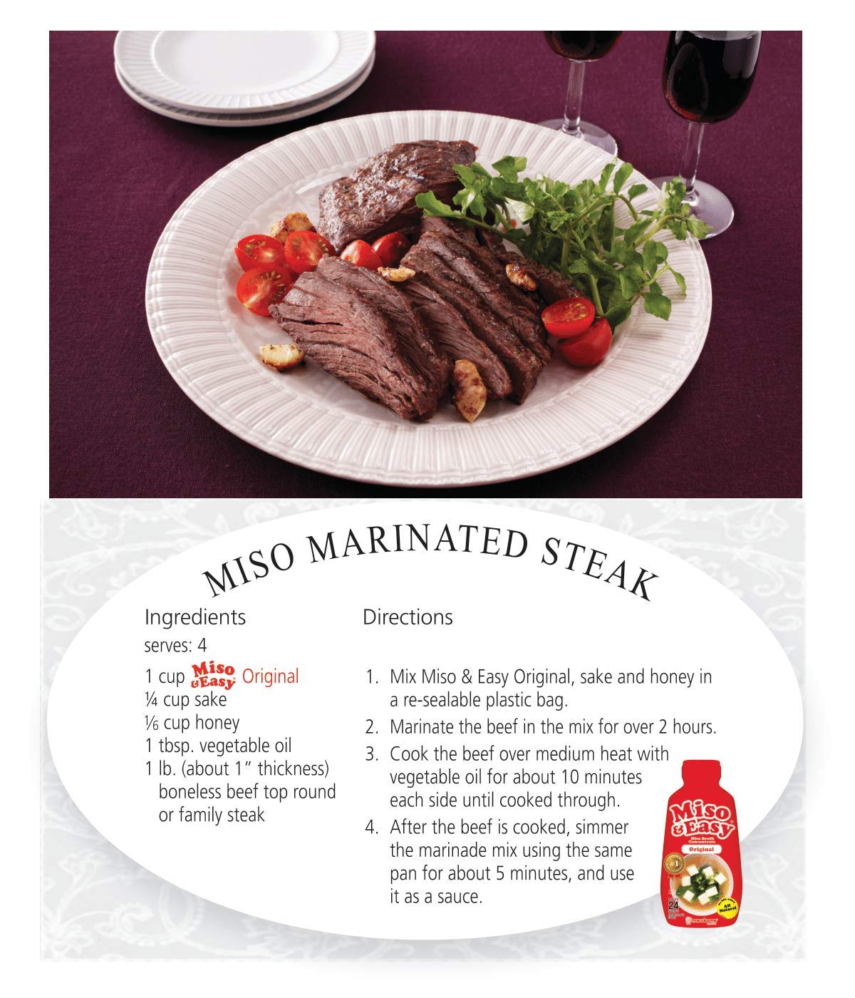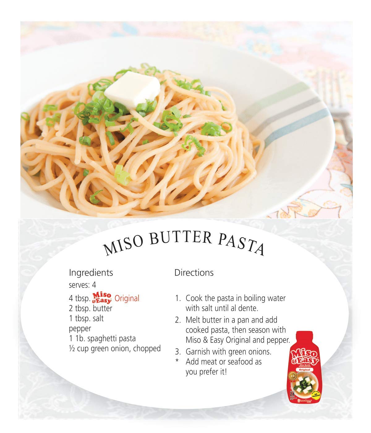 Miso's origins can be traced to China as far back as the 4th century BC. The written word Miso first appeared around 800 BC. In Japan, it is said that Miso was introduced in the 7th century by Buddhist monks. The process of making Miso was gradually refined and it became a vital part of the samurai diet. It was in the 17th century that industrial production of Miso first began. High in protein and rich in vitamins and minerals, Miso played an important nutritional role in feudal Japan. Miso is still widely used in Japan, both in traditional and modern cooking, but it has been gaining worldwide interest, as well. Marukome Co. manufactures approximately 100,000 tons of Miso annually, making it Japan's largest producer. It means Marukome is the Number 1 miso company in the world. Miso and easy-''original,'' an authentic blend of Miso and bonito. It contains Vitamins, Magnesium, Protein, Sodium, Carbohydrate, Iron, and minerals.There are no other such food which contains so much nutrition even in the world. Miso and easy- original is a new and innovative liquid of Marukome Miso. Made from fermented soybeans, rice, and koji. Miso is a thick paste-like substance. It is brown in color and tastes pleasantly salty, tangy, and savory on its own. Also you can feel Umami in miso taste. Miso has a surprisingly low salt contents. While the most common use of Miso is in Japanese-style Miso soup. Japanese usually make miso soup with wakame kelp, tofu, and green onion. You can make your original miso soup easily using miso and easy and your favorite toppings like cheese, tomato, corn, popcorn, or batter. Miso also adds a unique burst of flavor to salad dressings, sauces and marinades, baked tofu, vegetable dishes and even dessert sorbets. Our Miso & Easy is the concentrate type of miso. You can make 24cups of miso soup per bottle. Please try not only miso soup but also other dishes like we added images.