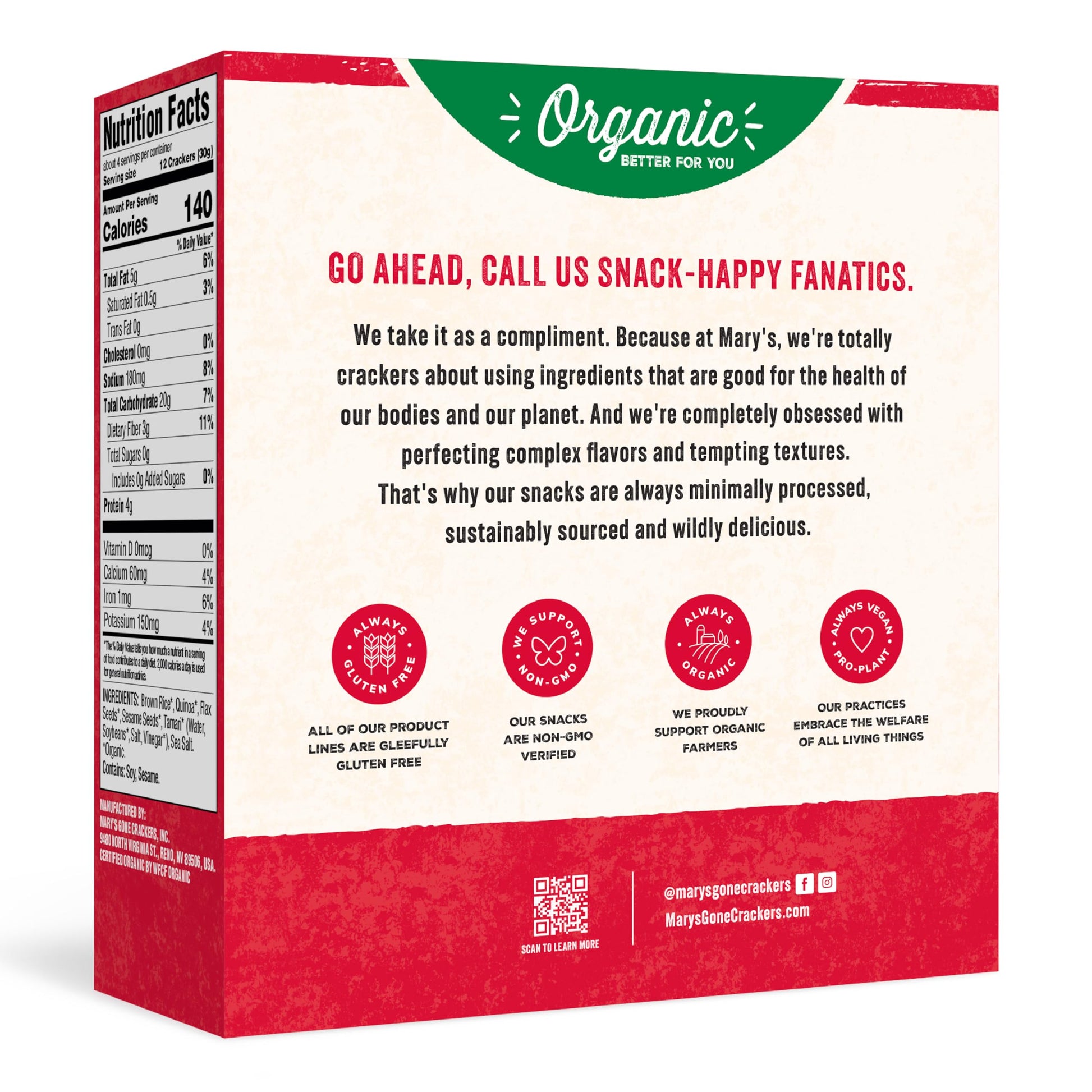 One Box Might Not Be Enough! The Original, The Cracker Started It All And Remains The Choice Of Marys Loyalists Everywhere. Why? Because It Was A Resounding Yes! To The Question Can A Gluten-Free Cracker Taste Great And Use Only Clean And Simple Ingredients? Marys Gone Crackers Original Crackers Combine Organic, Gluten Free, Whole Grain Brown Rice, Quinoa, Flax Seeds, Sesame Seeds And Tamari To Create A Cracker With A Rich, Earthy Flavor And Marys Signature Satisfying Crunch.