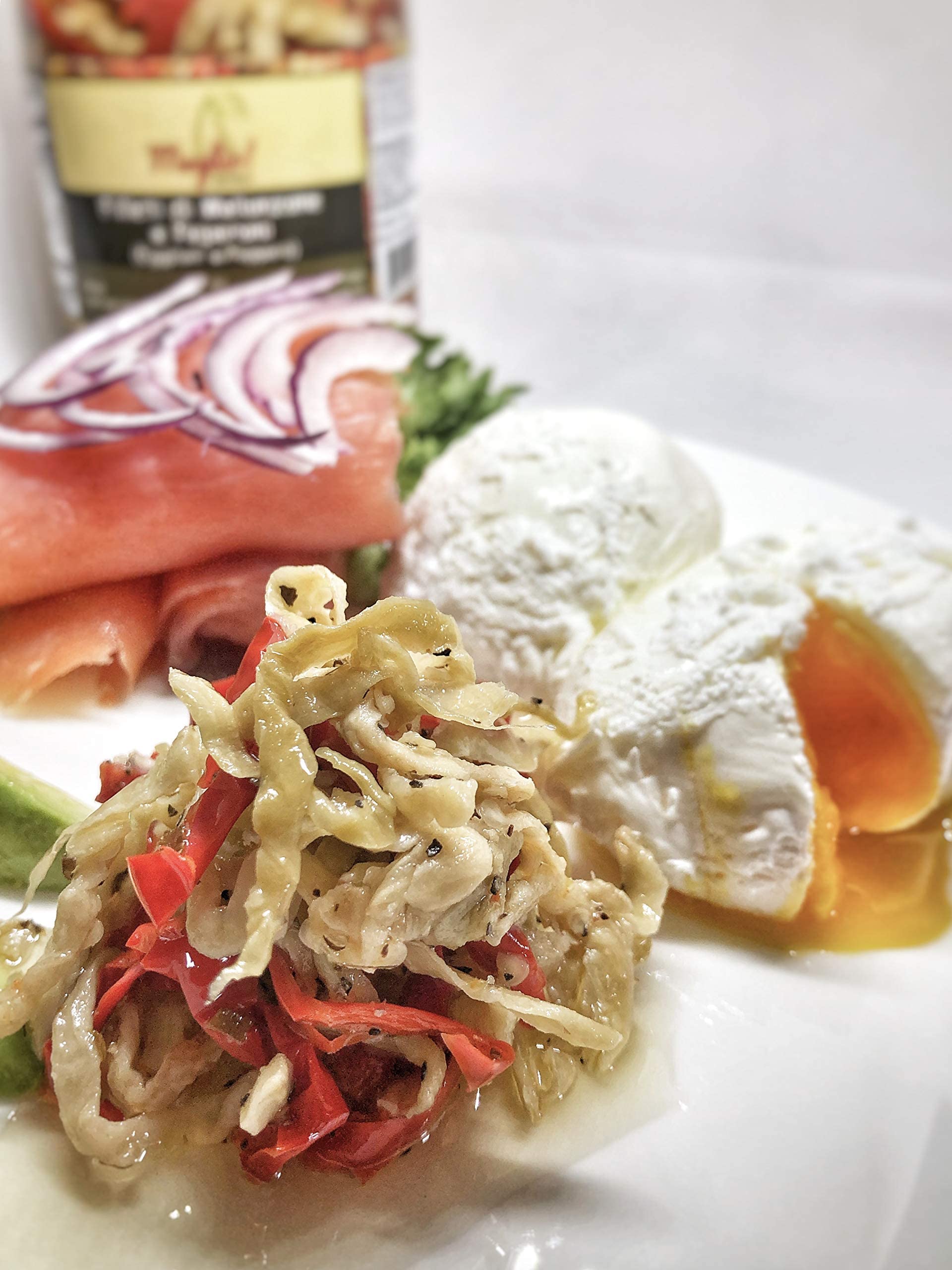 Q: What ingredients are in Melanzane e Peperoni?A: Melanzane e Peperoni contains eggplant and bell peppers, making it a delicious and healthy Italian appetizer. It is made from 100% natural ingredients, ensuring a fresh taste.