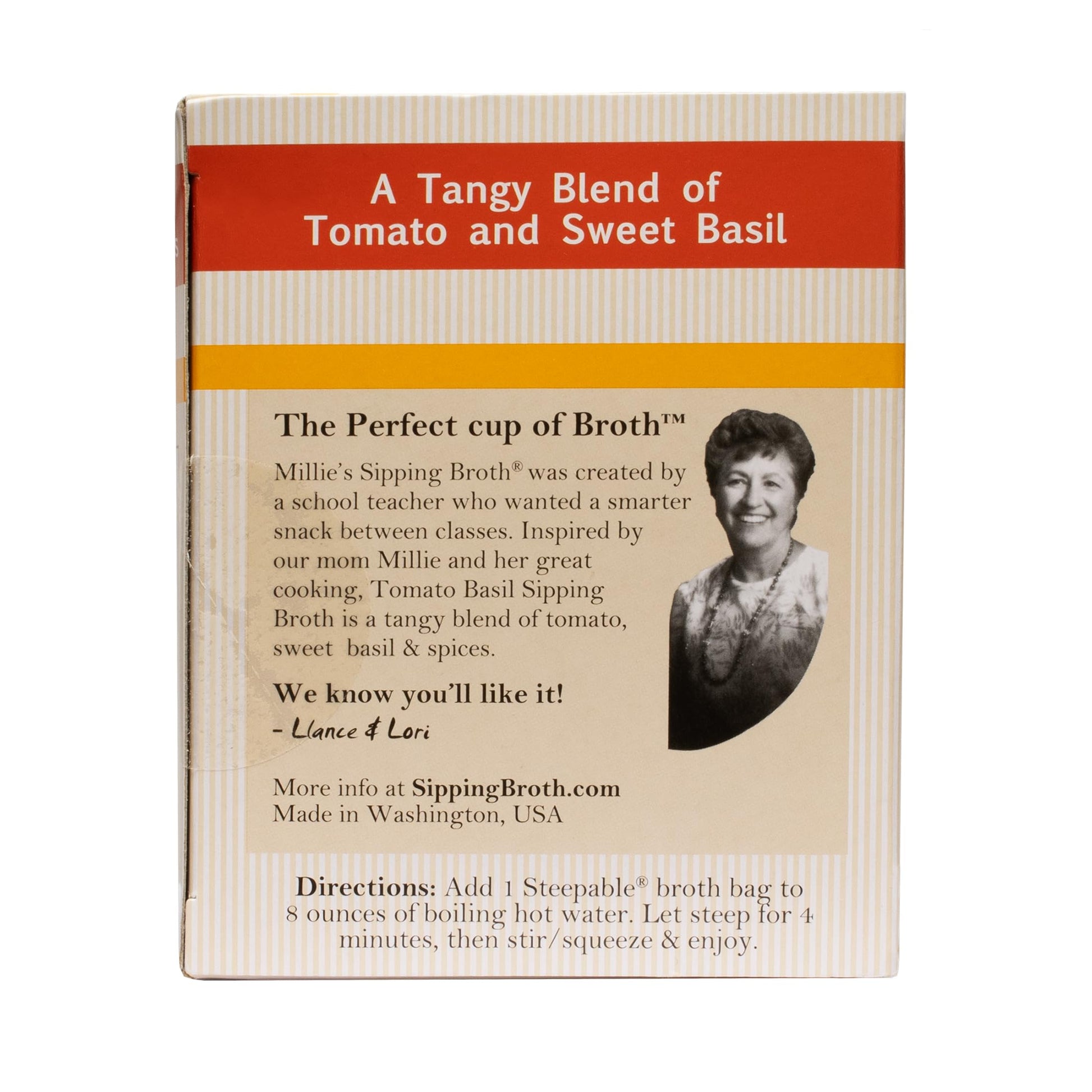 Millie'S Tomato Basil Sipping Broth Is A Tangy Blend Of Tomato & Sweet Basil. Easy To Make Fresh Every Time With Just A Mug And Hot Water. 12 Servings, Individually Wrapped In A Recyclable Box. This First-Of-Its-Kind Savory Single Serve Hot Beverage In A Steepable Broth Bag Delivers An Amazing Taste Using The Highest Quality Vegan, Natural, Wild Harvest, Gluten-Free Ingredients. Created By A Teacher Who Wanted A Savory Treat Between Classes And Meals. It Really Is Comfort Food In A Broth. Keto Friendly Gluten Free Plant-Based - Vegan Certified Kosher By Ksa Ingredients: Yeast Extract, Dried Tomatoes, Sea Salt, Dried Basil, Dried Garlic, Dried Carrots, Dried Onion, Rice Hulls, Dried Celery