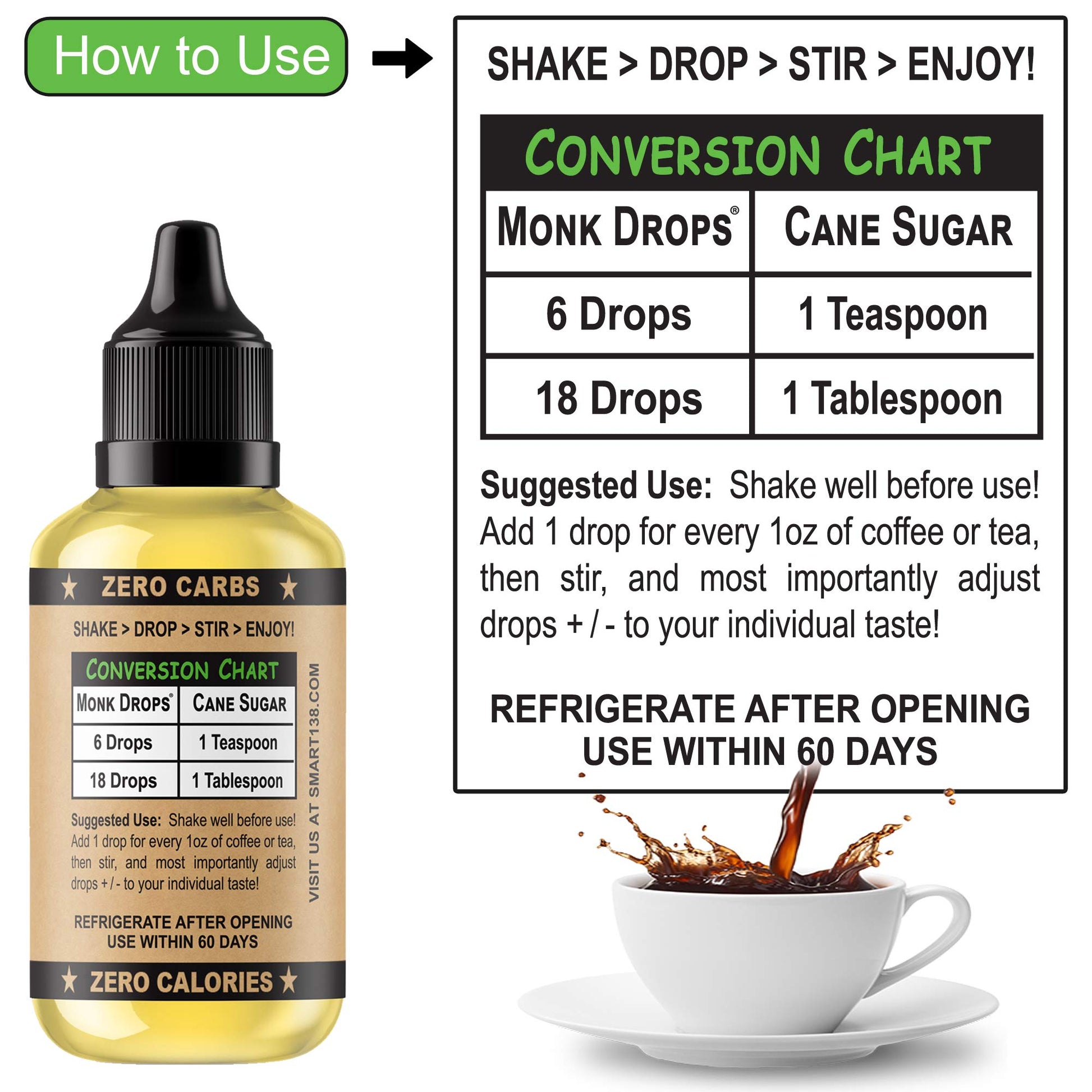 Q: What is Monk Drops and how is it used?A: Monk Drops is a natural sweetener made from 100% monk fruit extract, available in a concentrated liquid form. Just a few drops can sweeten a typical 6oz cup of coffee or any other beverage, making it an ideal sugar substitute.