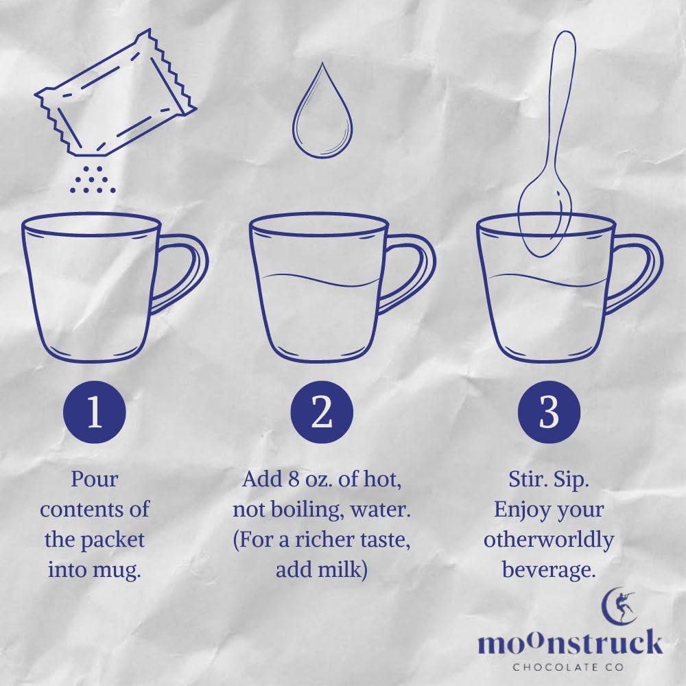 Q: How do I prepare Moonstruck Chocolate Mint Hot Chocolate?A: To prepare Moonstruck Chocolate Mint Hot Chocolate, simply open one single serve packet, add hot water or milk, stir well, and enjoy your delicious minty cocoa.