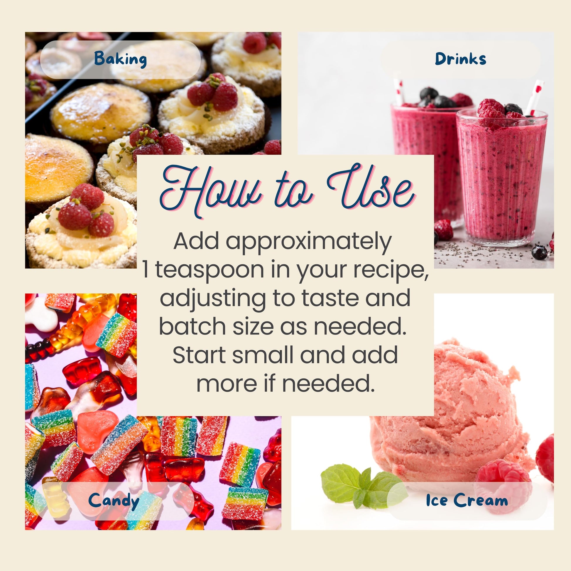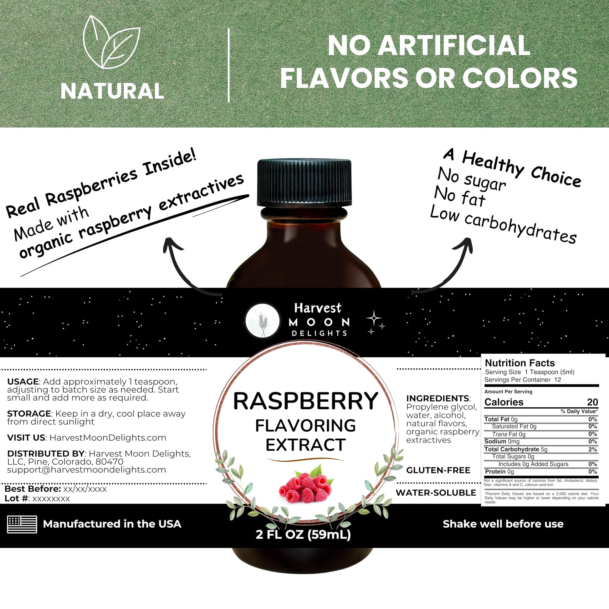 - Q: What can I use the Natural Raspberry Extract for? A: Our Natural Raspberry Extract is versatile and can be used for baking, cooking, and beverages. It's perfect for enhancing the flavor of cakes, cookies, smoothies, ice creams, cocktails, and more. Just a few drops can add a burst of fresh raspberry flavor to your favorite recipes.