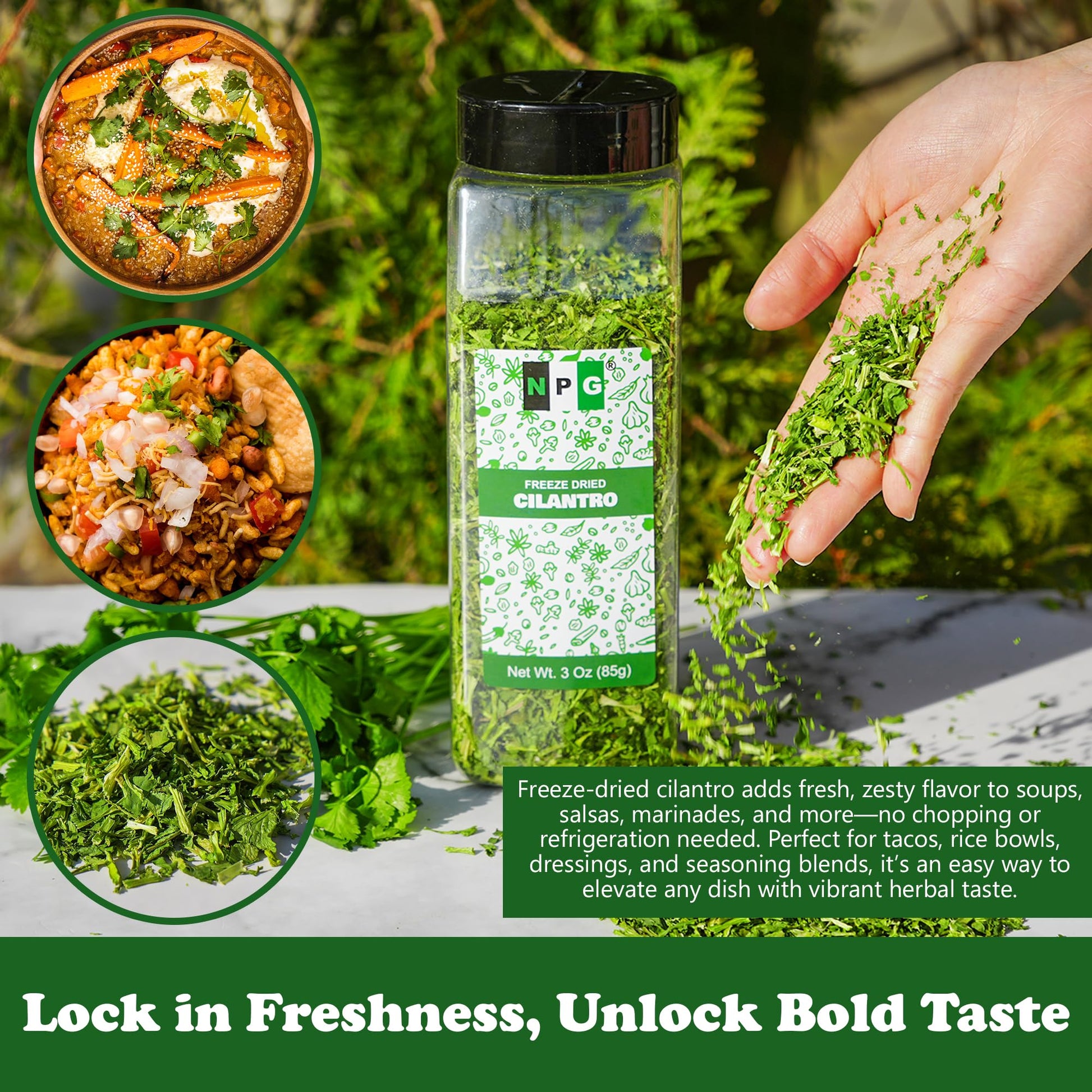 Q: What is the shelf life of NPG freeze-dried cilantro leaves?A: These freeze-dried cilantro leaves have a long shelf life, staying fresh for months when stored properly. This makes them a reliable pantry staple for home cooks and chefs.